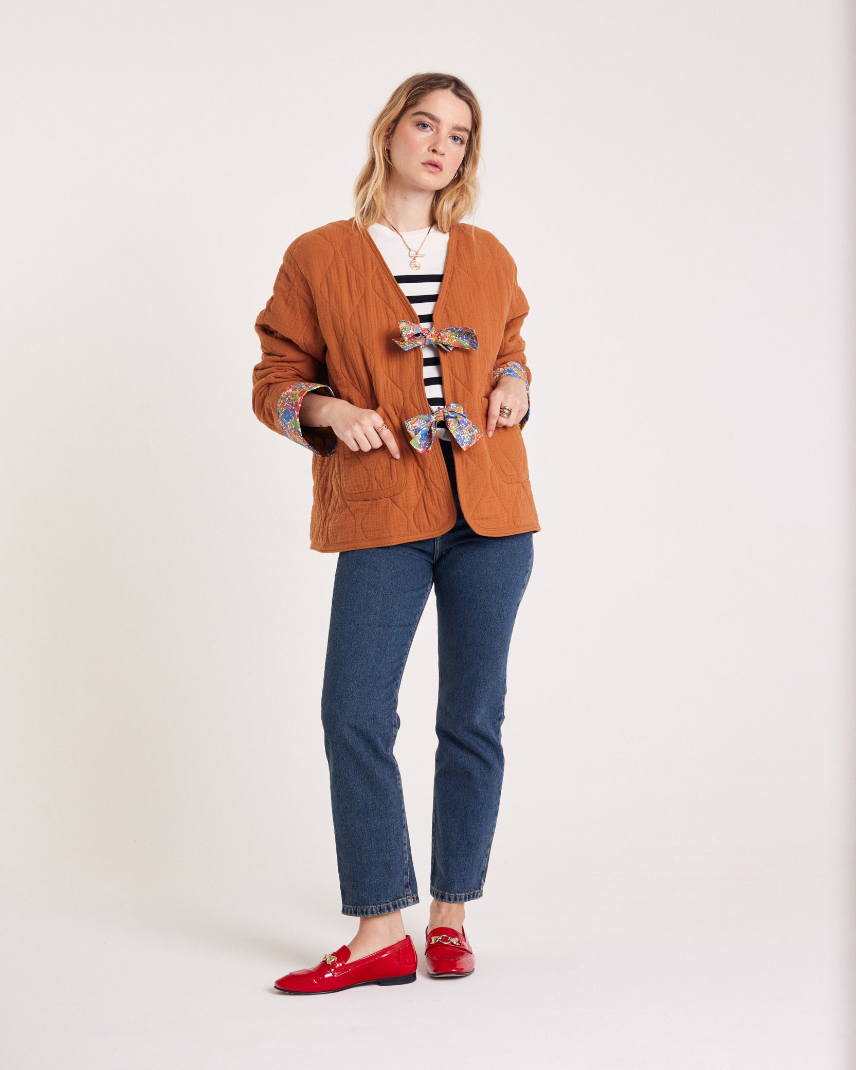 Ne cherchez plus la veste de mi-saison idéale, Poppy est celle qu’il vous faut ! En gaze de coton terracotta, elle séduit par son matelassage au motif vague et ses détails Liberty raffinés. Sa coupe effet sablier et son encolure V en font une pièce élégante et facile à porter.