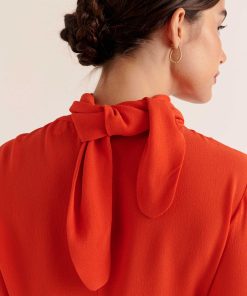 Laissez-vous séduire par la blouse Léontine orange. Nous adorons son col montant et son volant qui ajoutent une touche de fantaisie à cette pièce emblématique