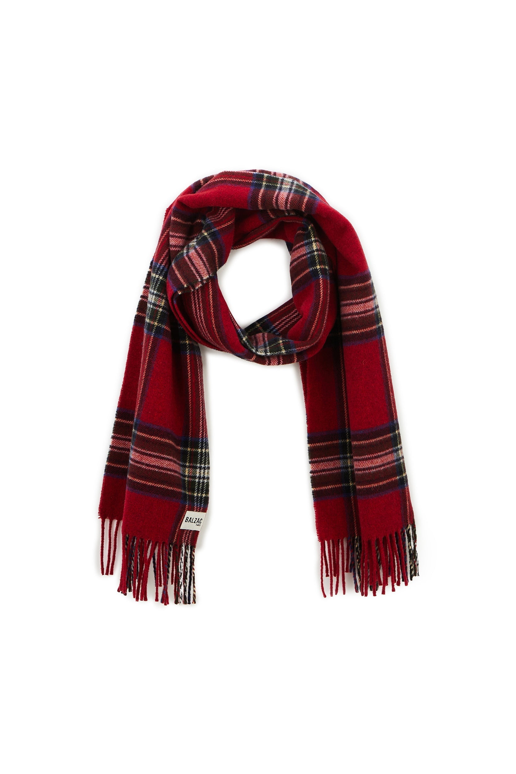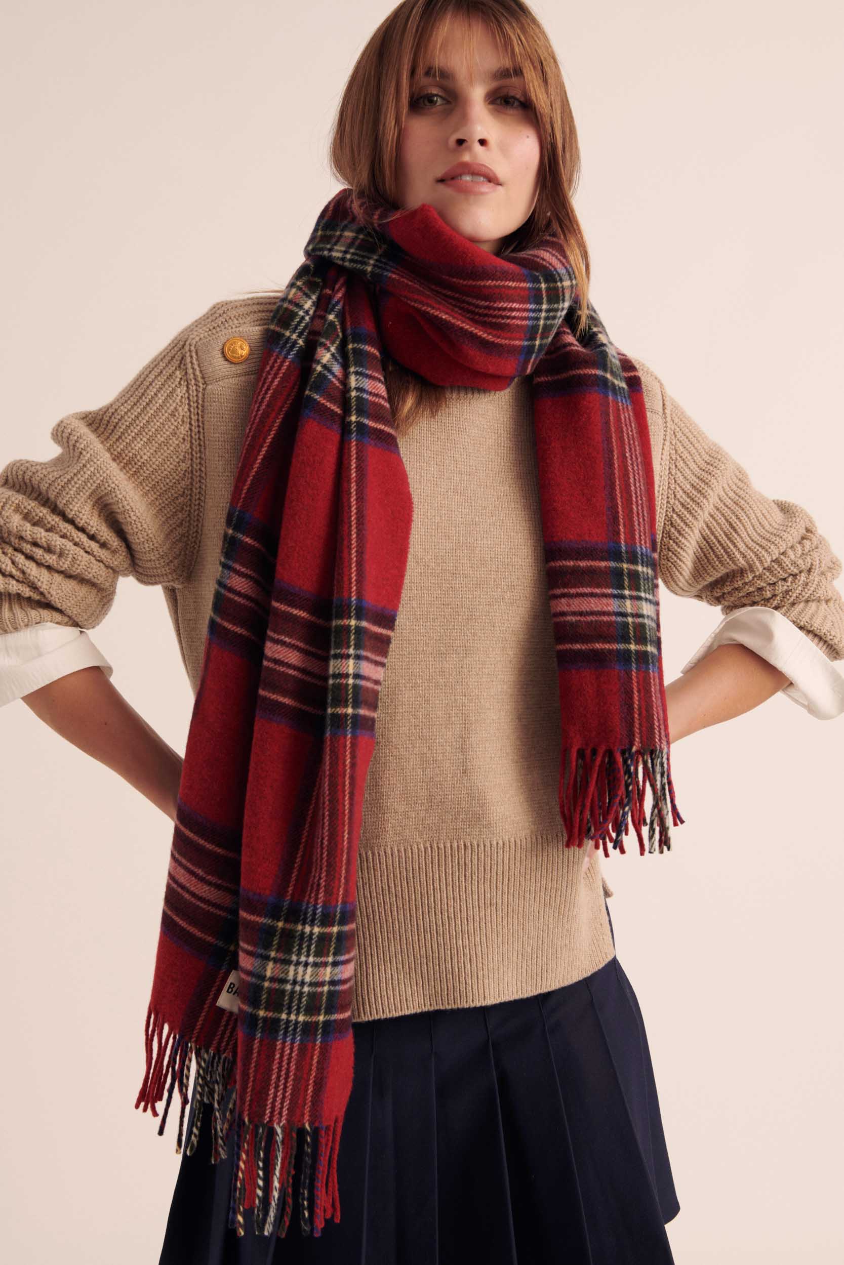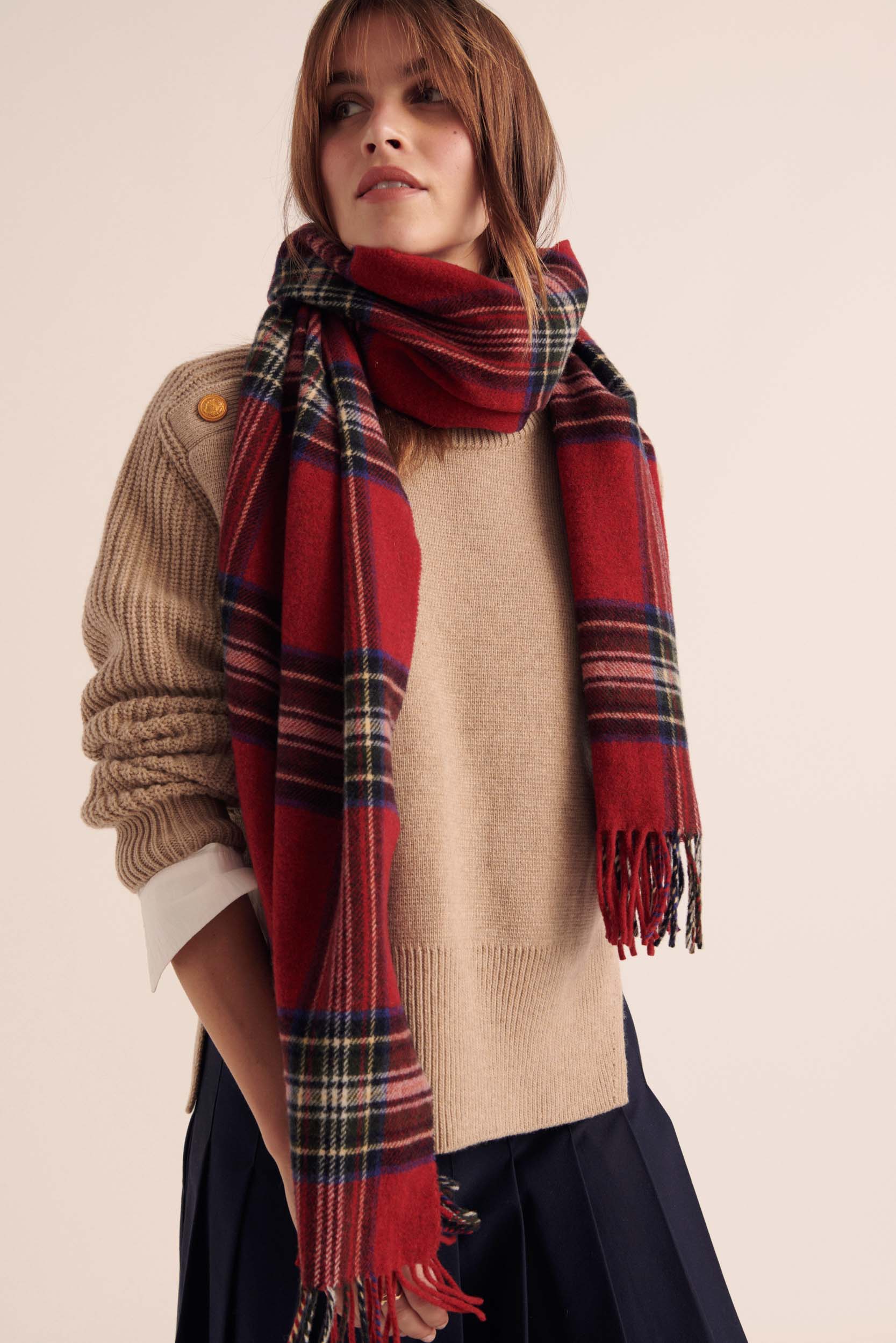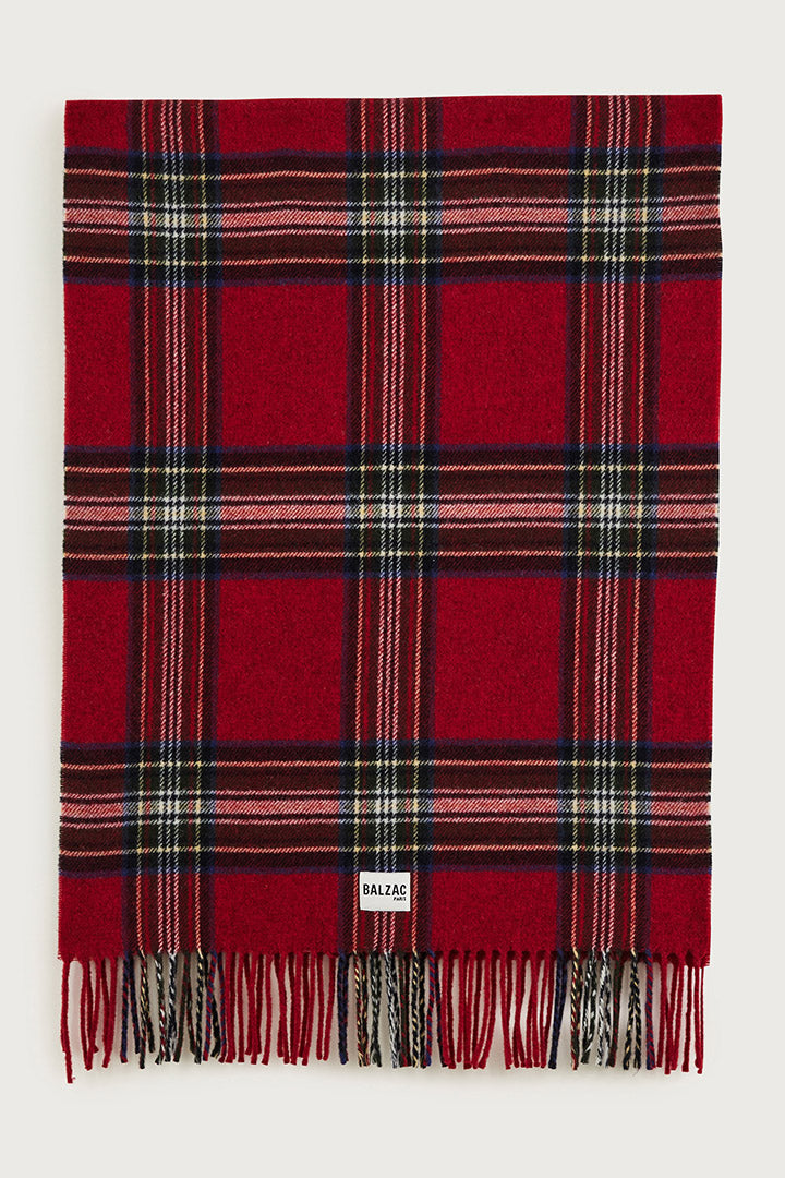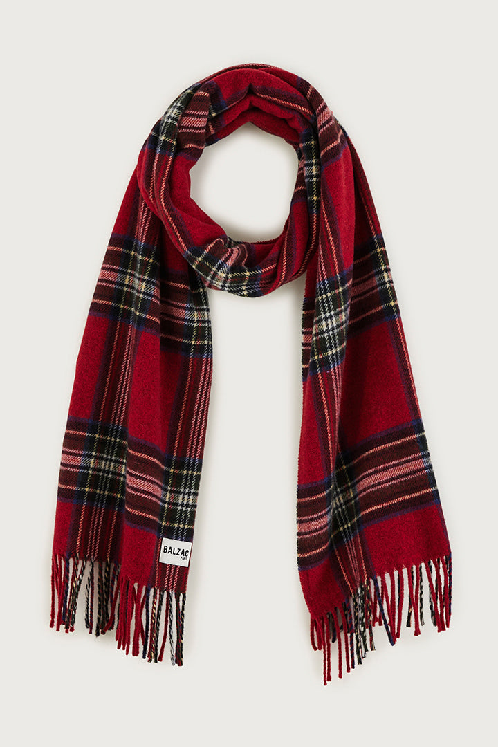Sur les épaules ou nouée autour du cou, l’écharpe Public tartan rouge vous suivra partout.
