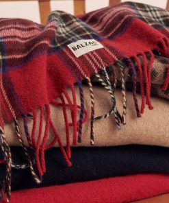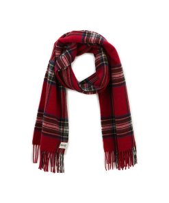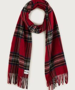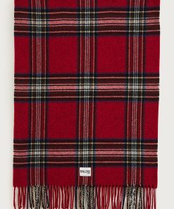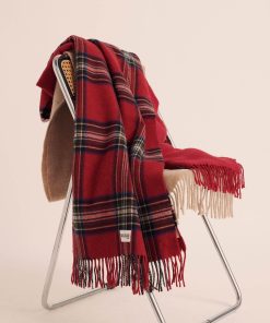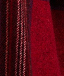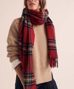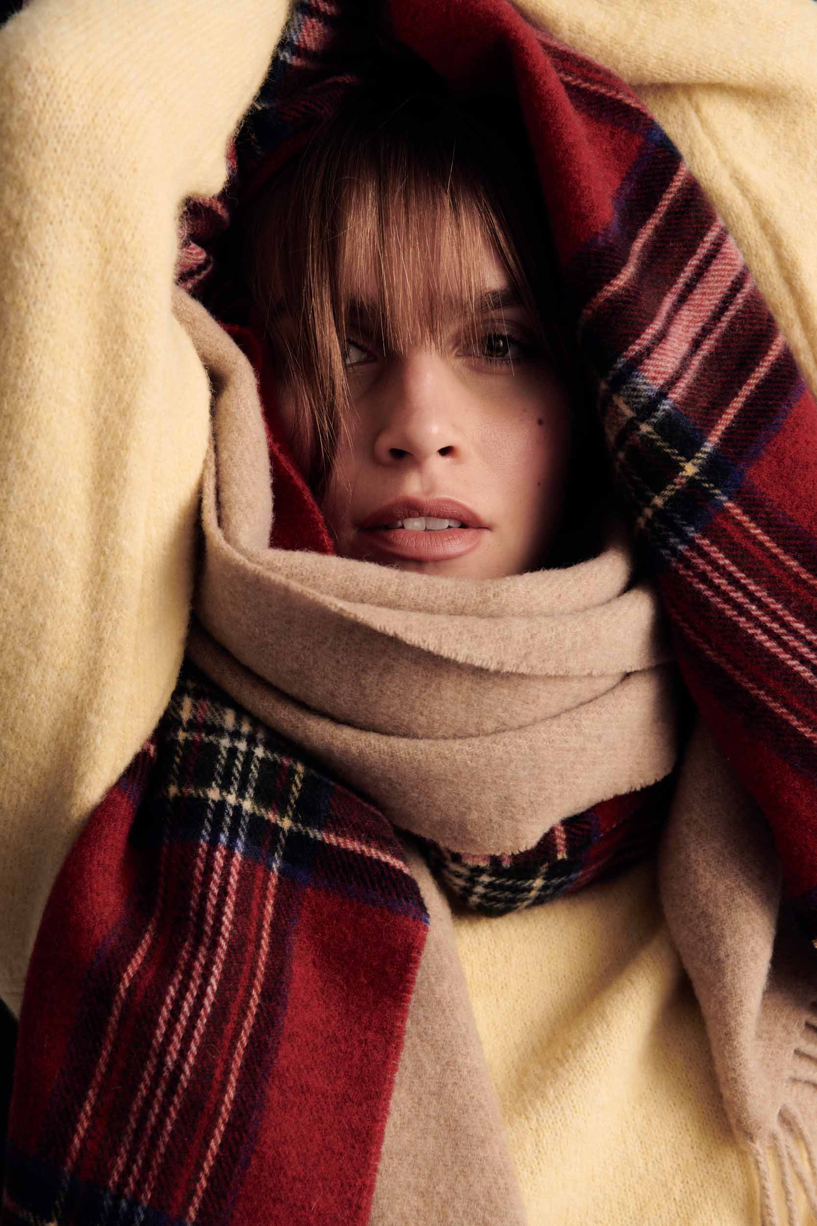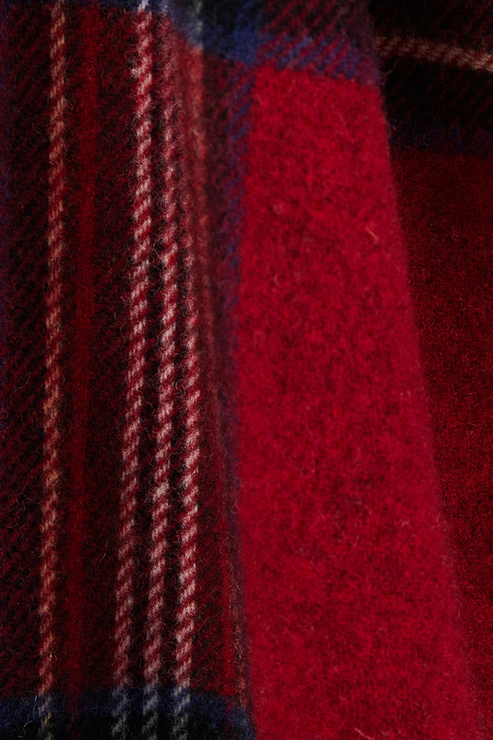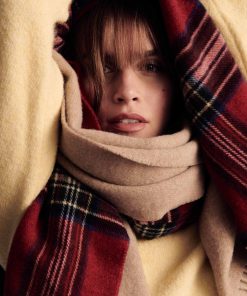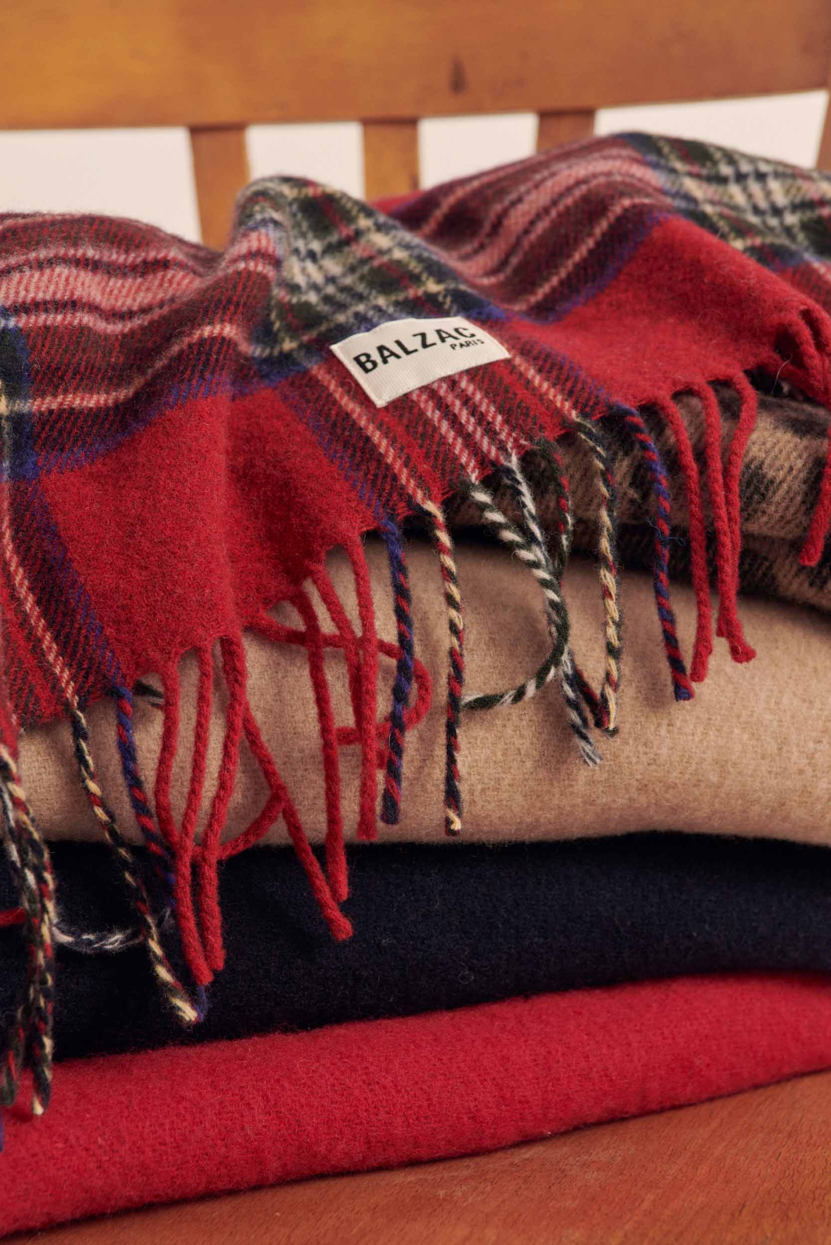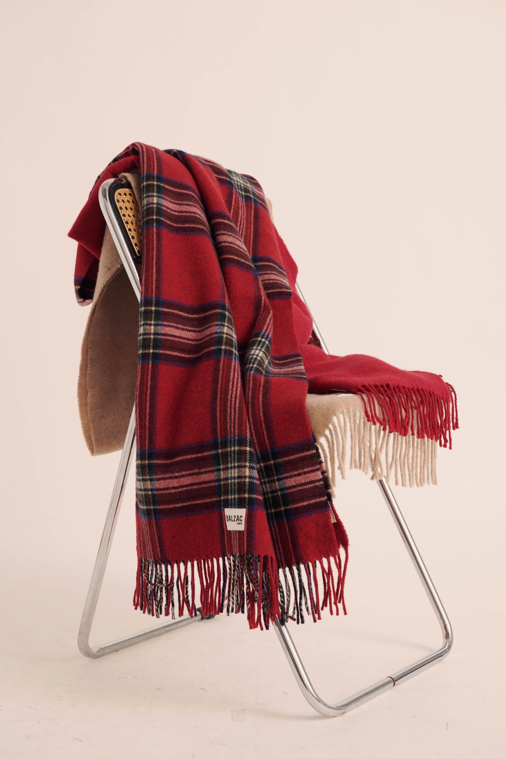 Sur les épaules ou nouée autour du cou, l’écharpe Public tartan rouge vous suivra partout.