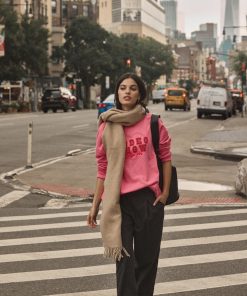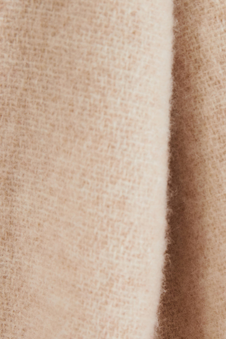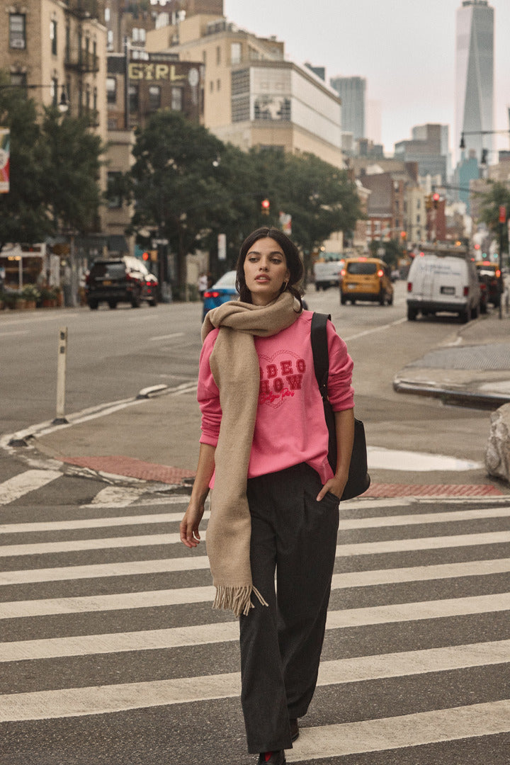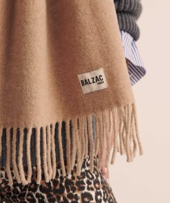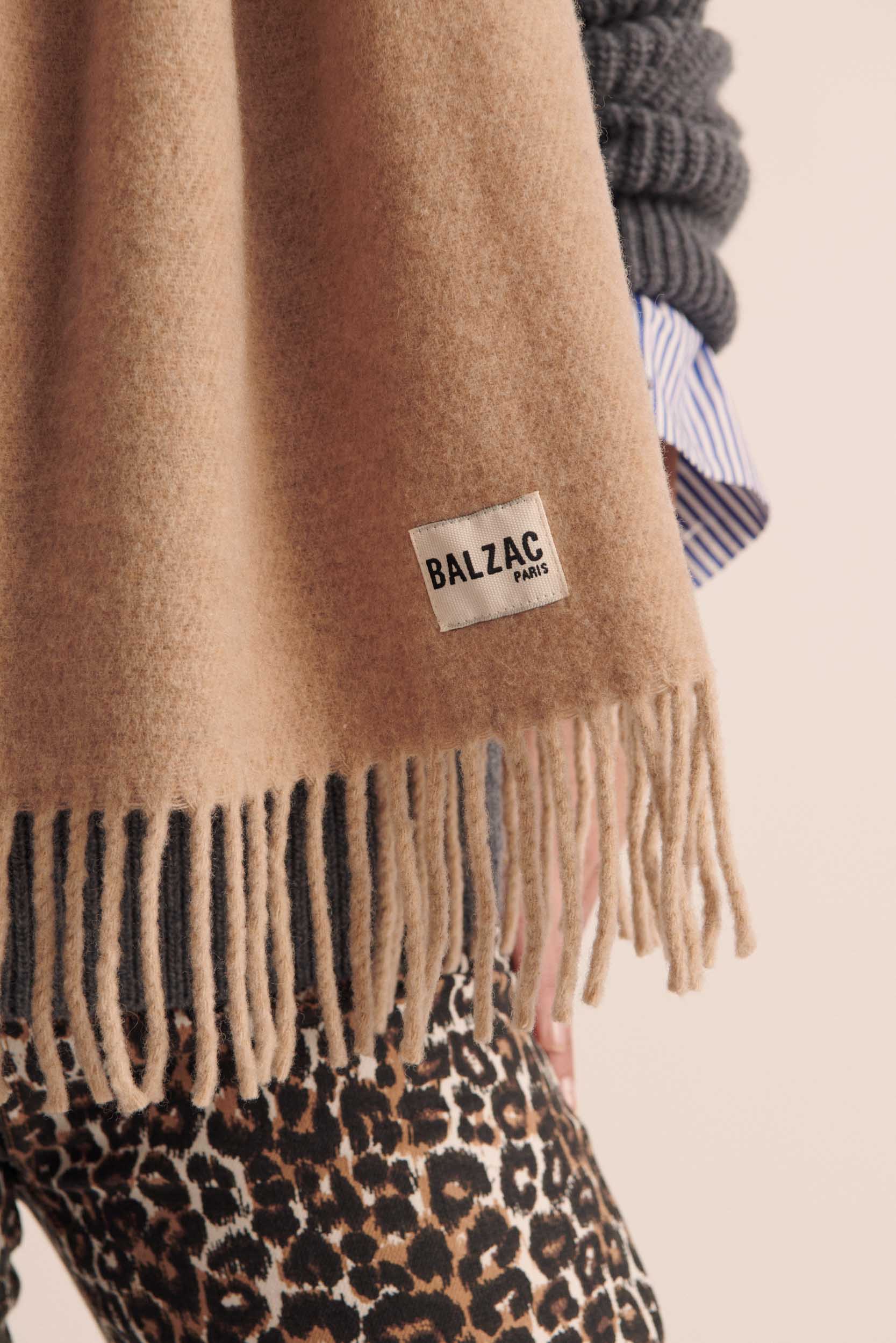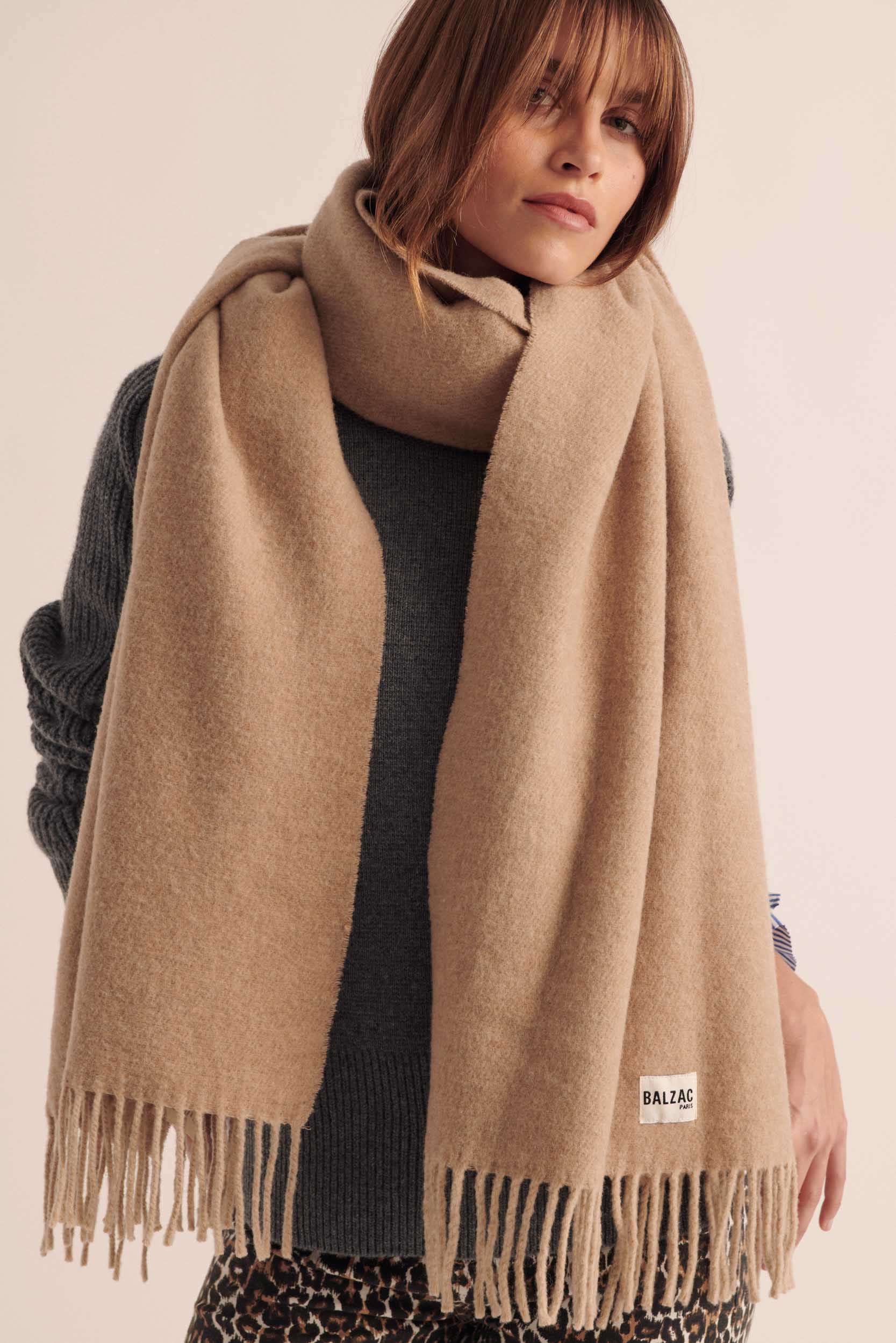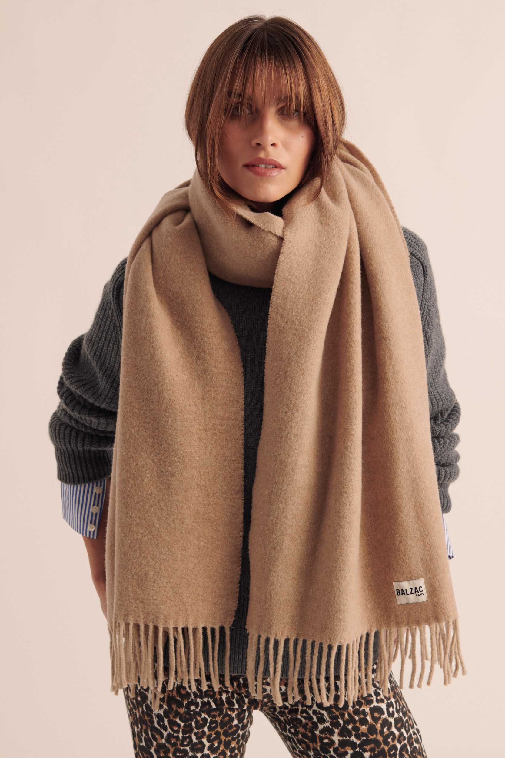 Sur les épaules ou nouée autour du cou, l’écharpe Public beige vous suivra partout.