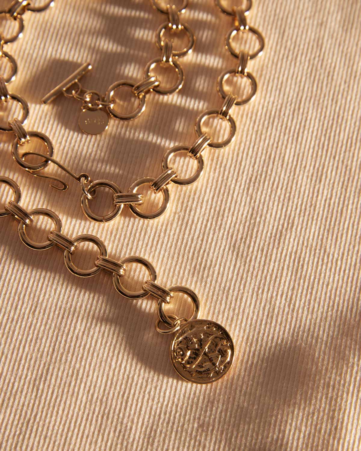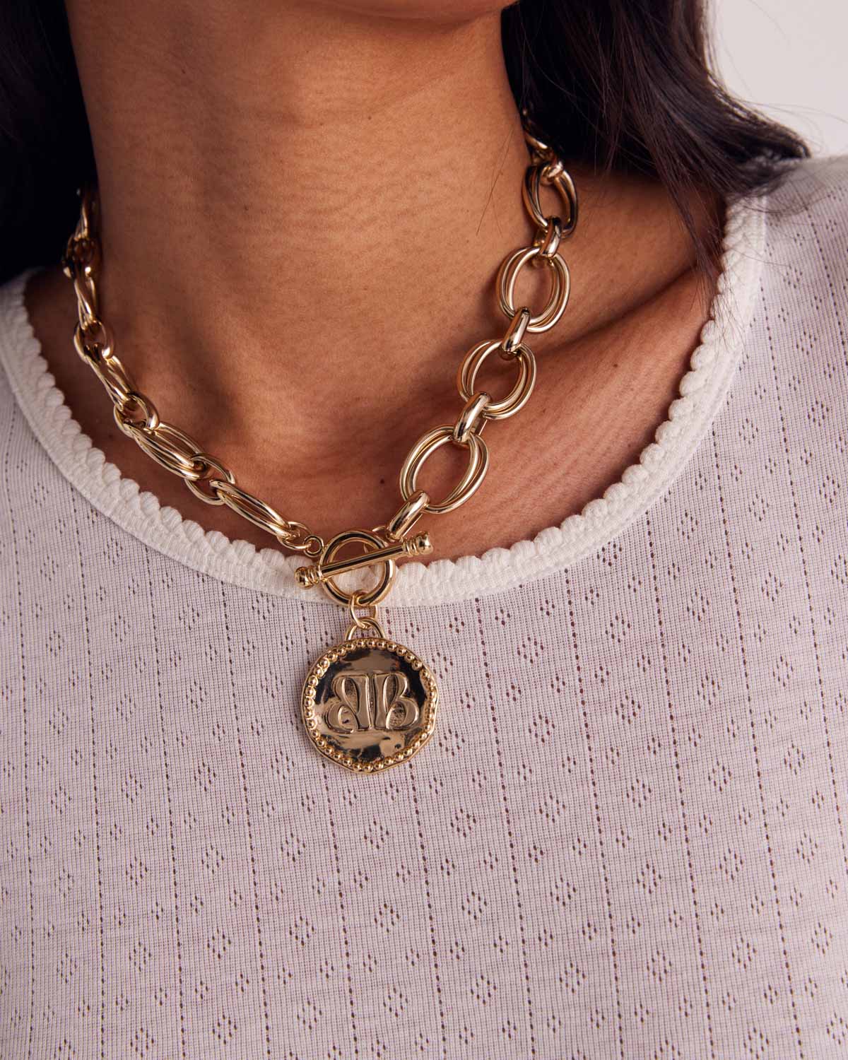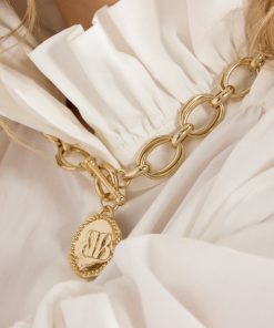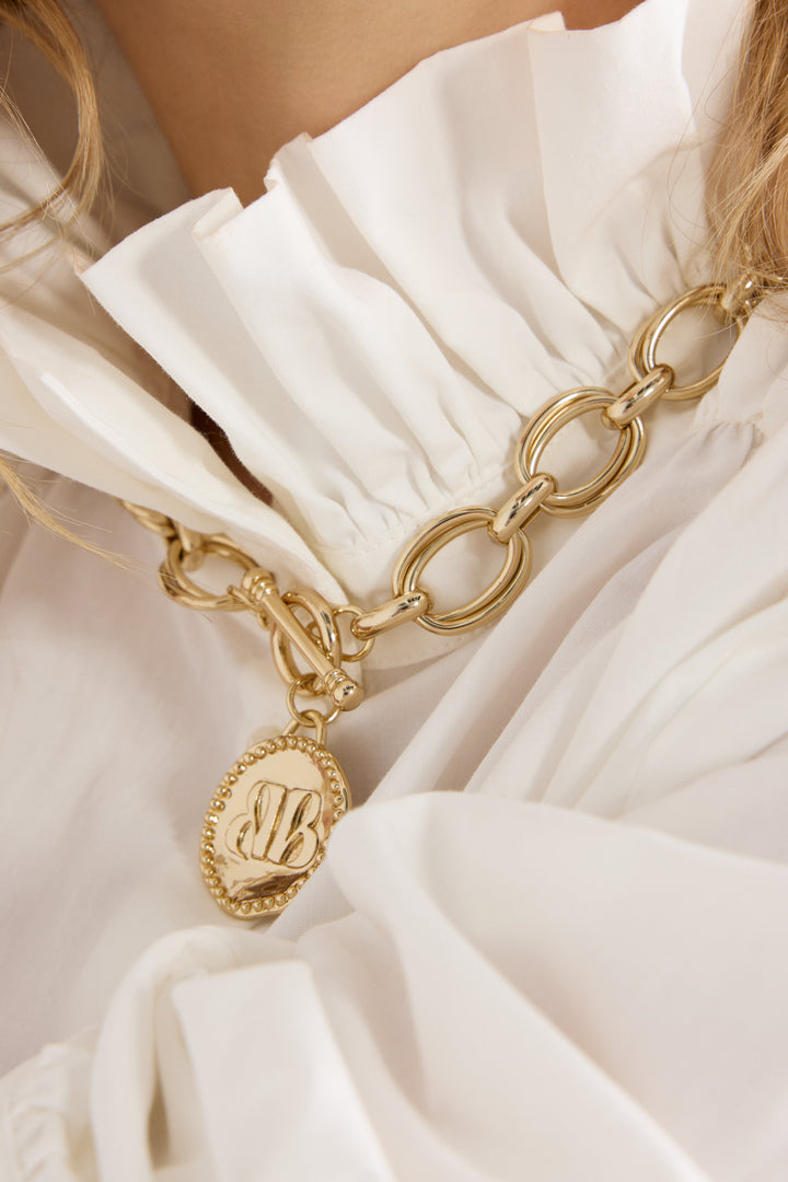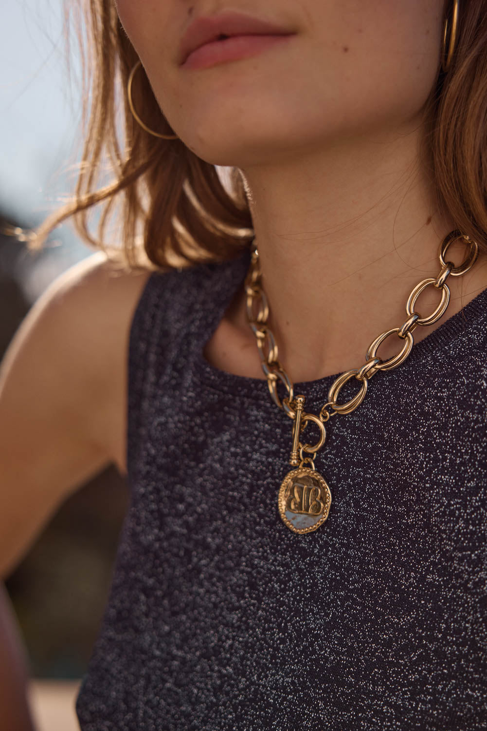 Le collier Peter doré se compose de maillons imposants et d’une médaille subtilement gravée du monogramme de Balzac Paris, reflétant ainsi un esprit à la fois classique et contemporain.