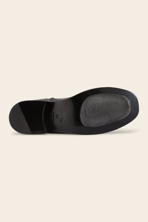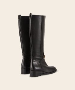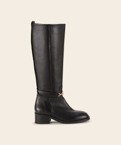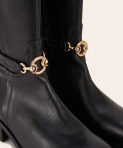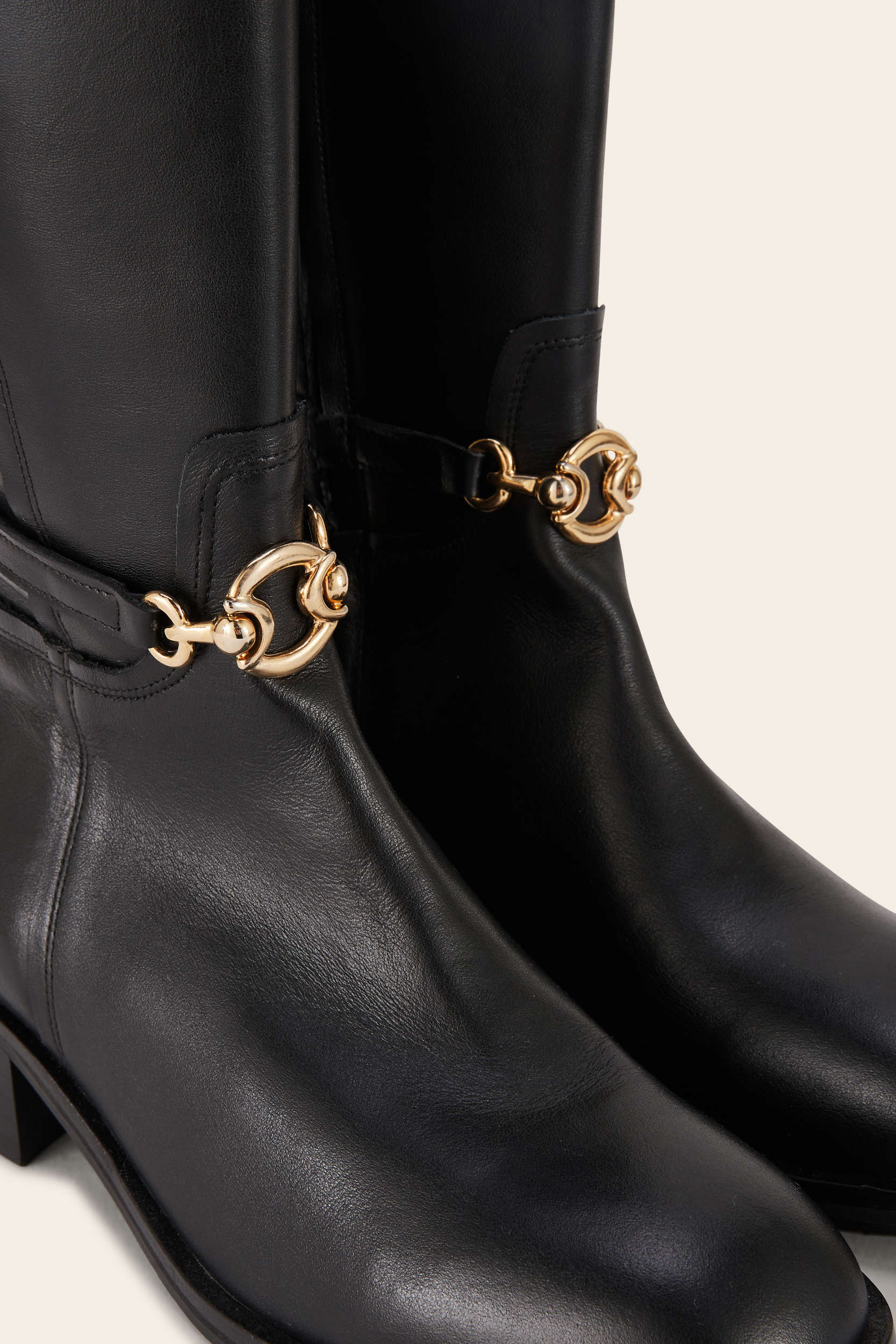Élégante et intemporelle, la botte Tyler incarne la cavalière incontournable de cet hiver. Dotée d’un talon bas pour un confort optimal, elle est une alliée de choix pour toutes vos aventures quotidiennes. En cuir lisse noir, elle se distingue par un détail subtil mais audacieux : un mors métallique, clin d’œil à notre ceinture Brandon.