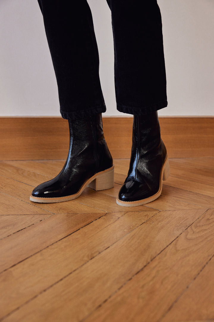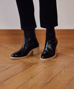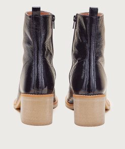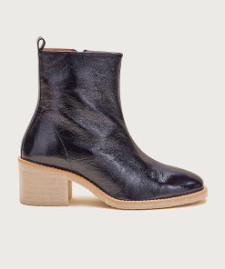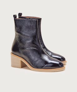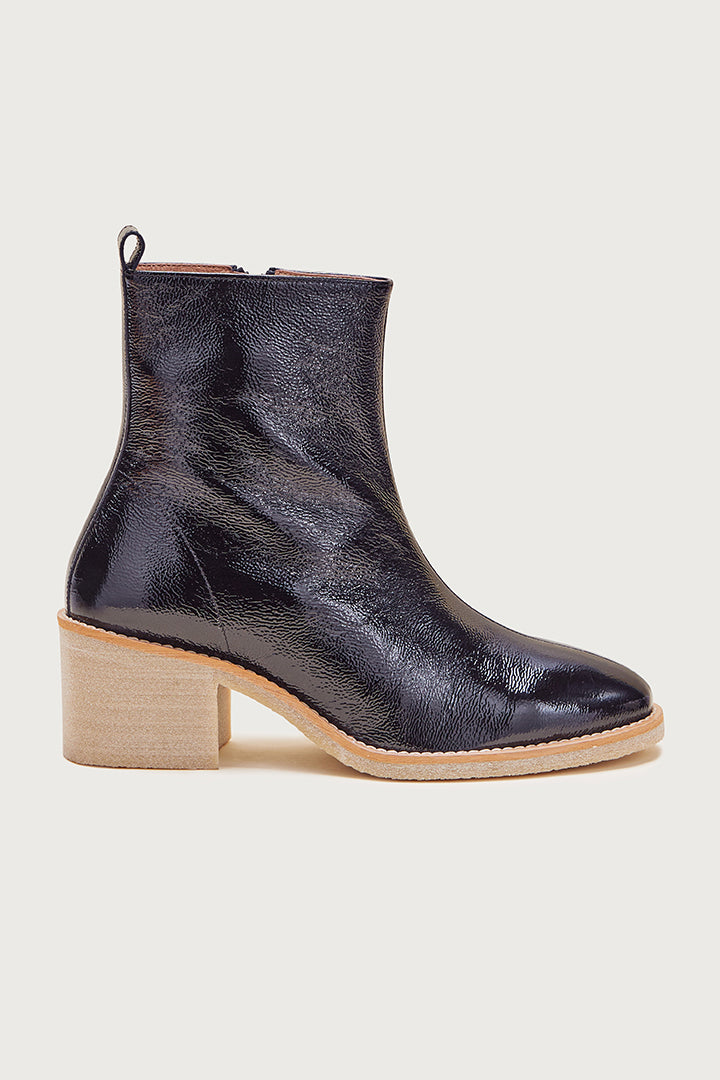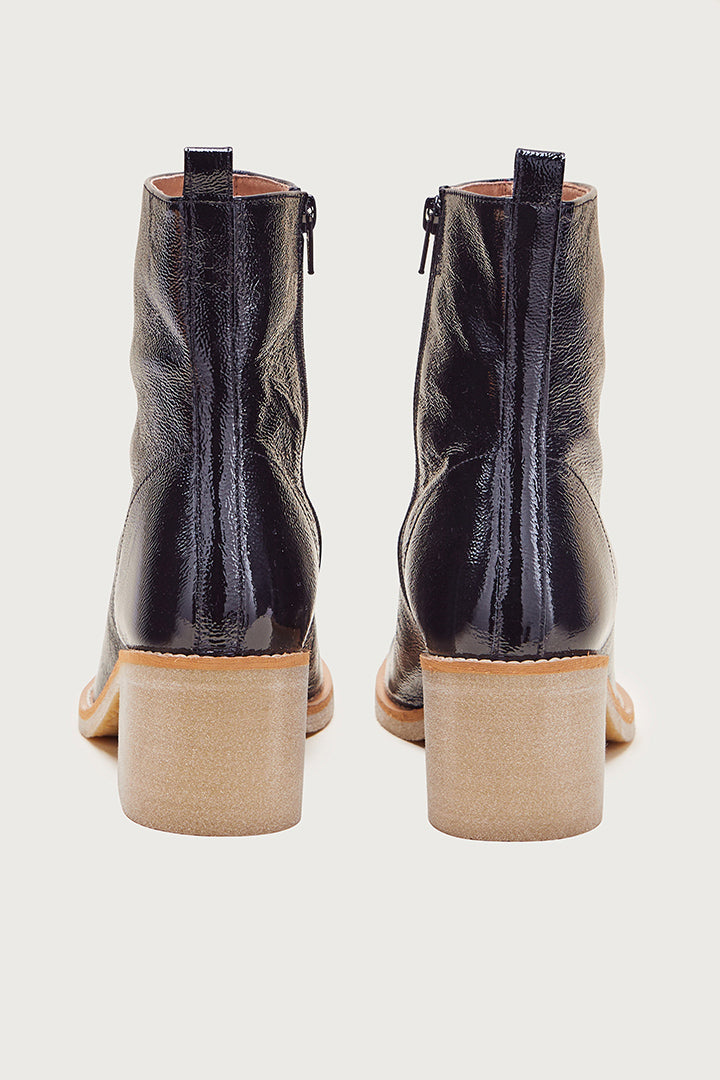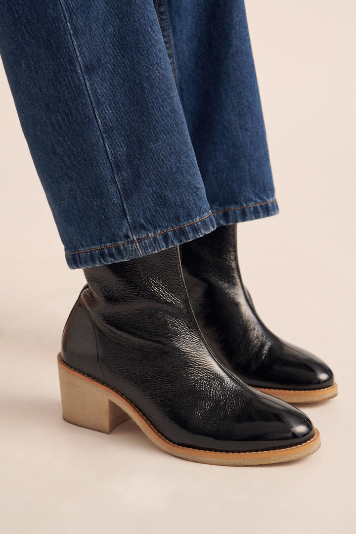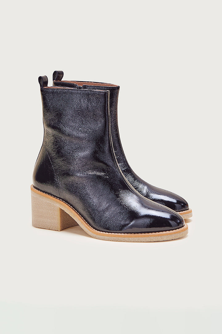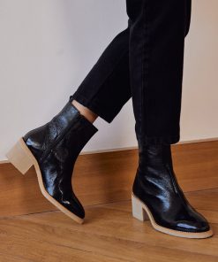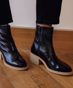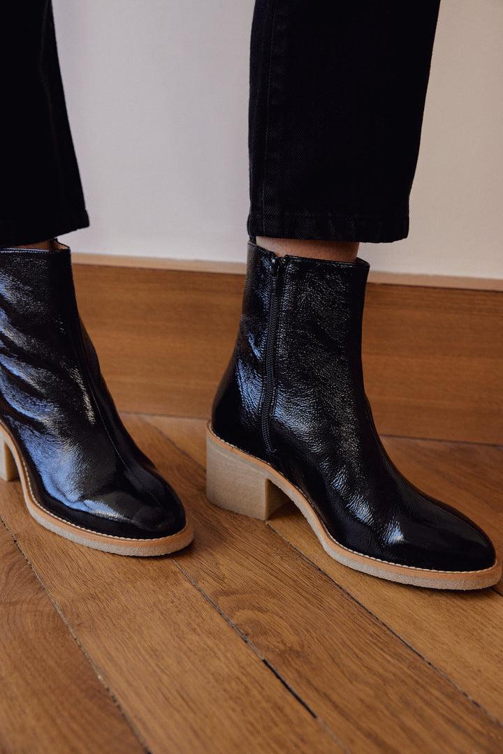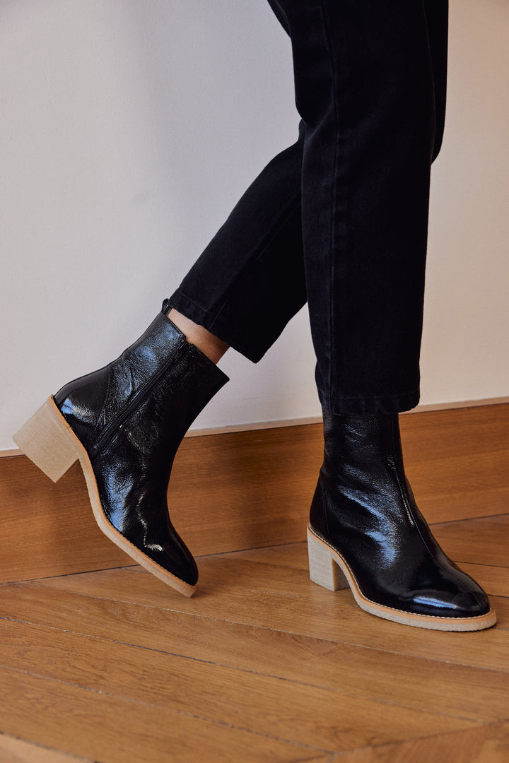 Idéales par la taille de leurs talons, les bottines Allure vernis froissé noir s’associent très bien avec un pantalon, une jupe ou une robe.