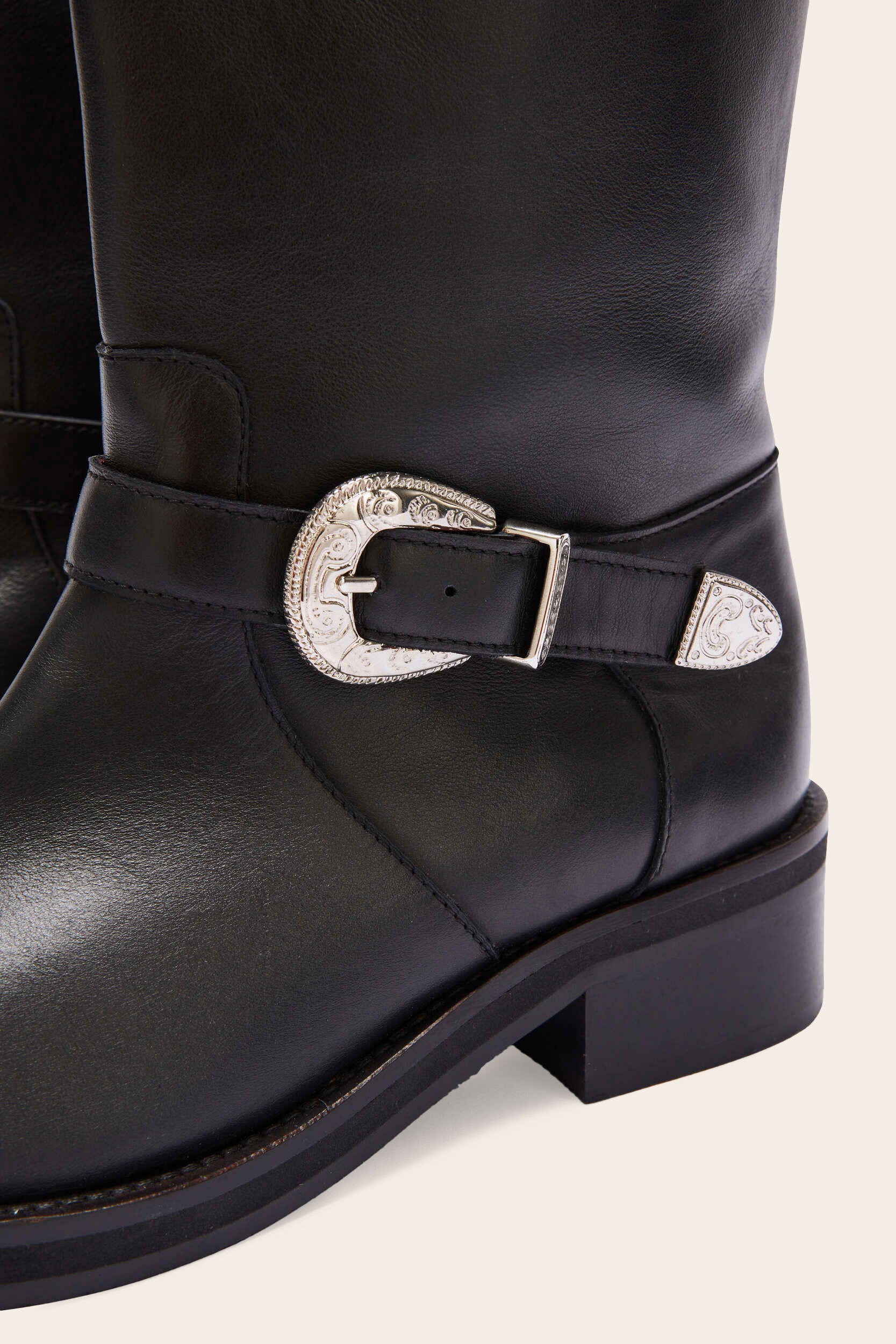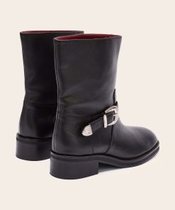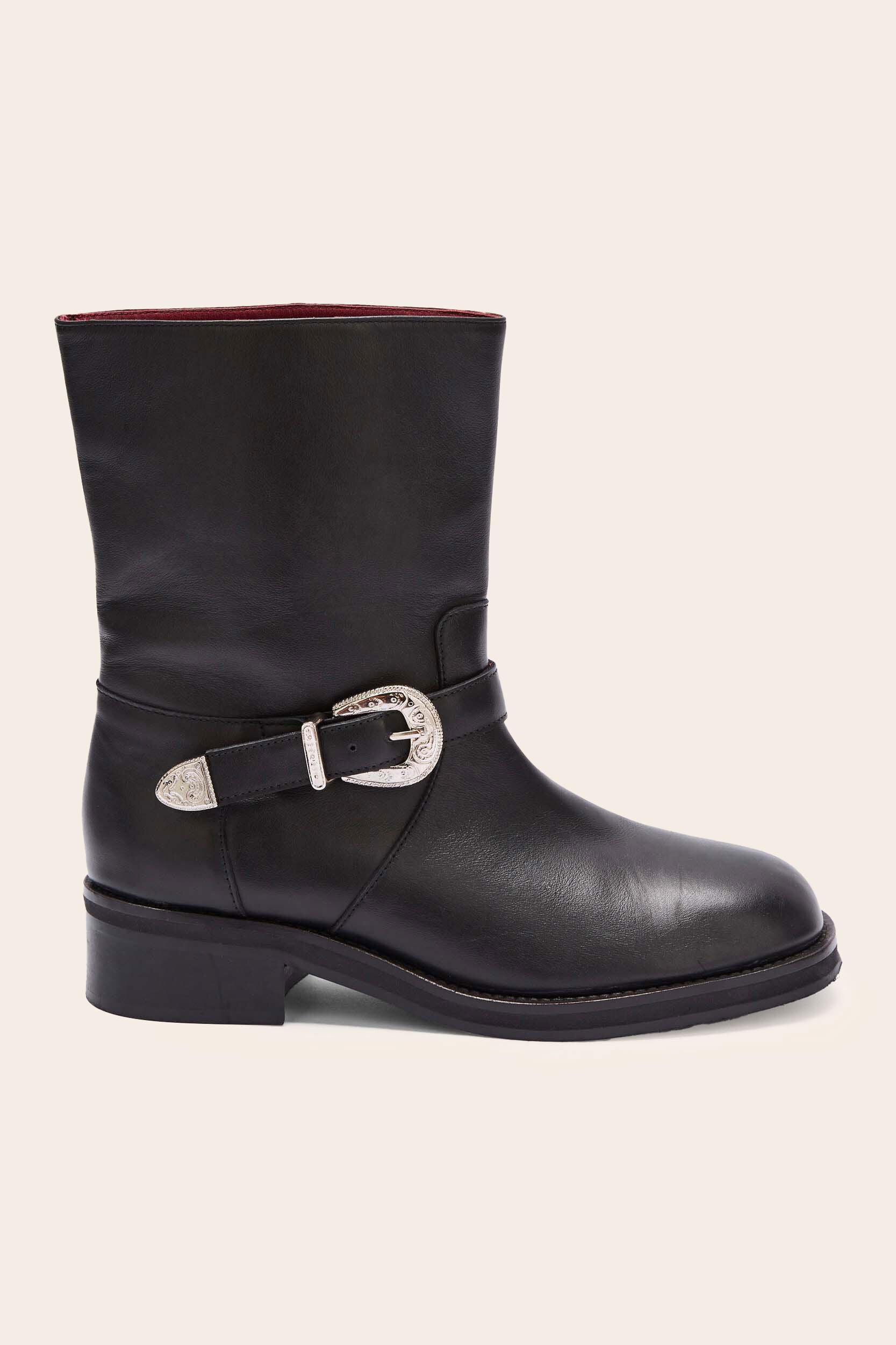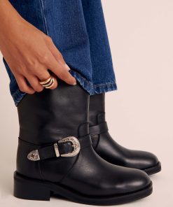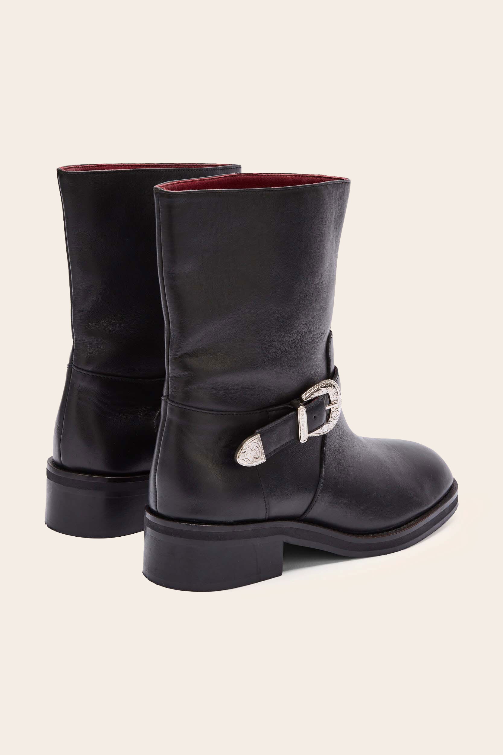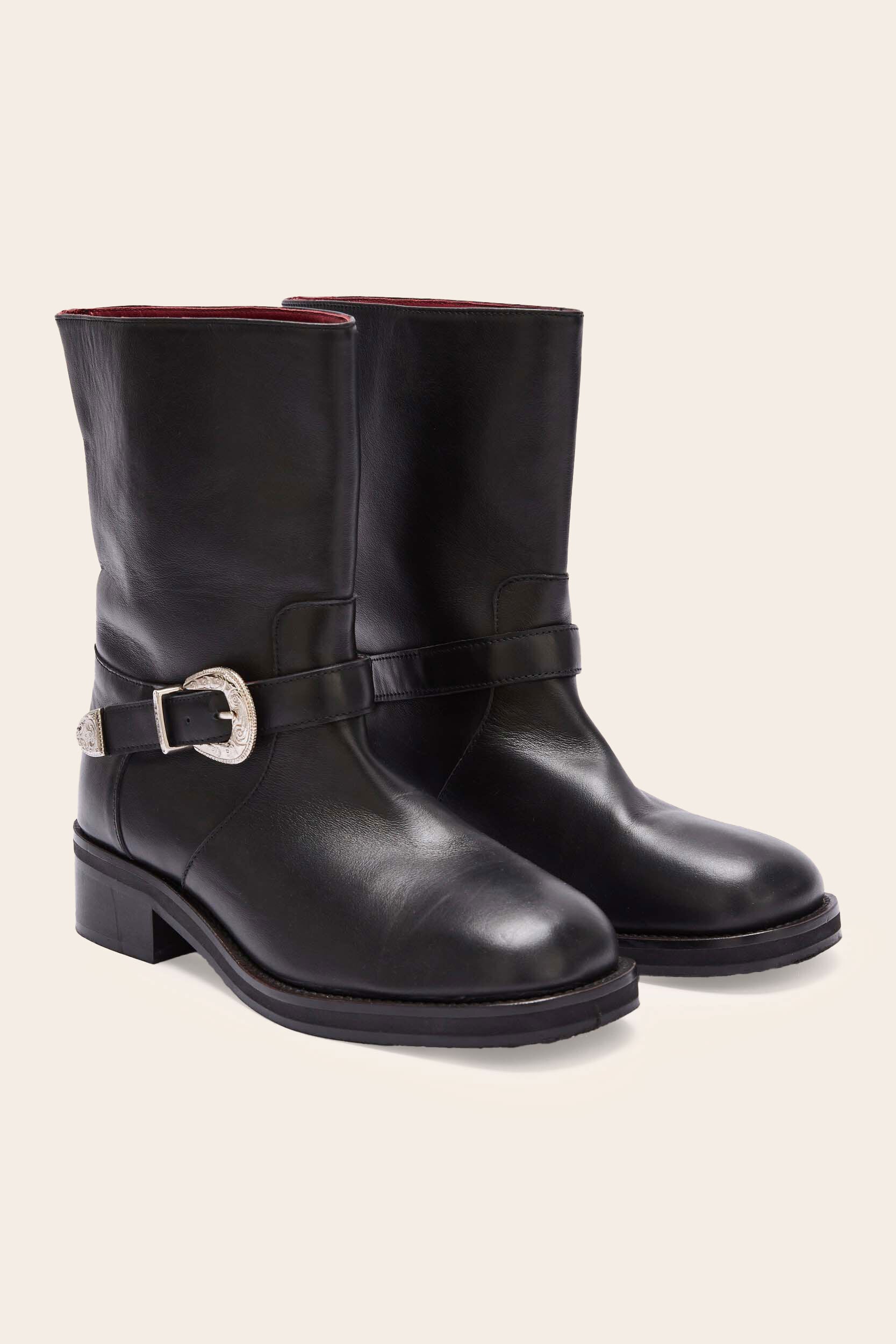 Bottine motarde revisitée, la Sharon est parfaite pour un look audacieux. Confectionnée en cuir lisse noir, elle se distingue par ses détails métalliques qui lui apportent une touche rebelle et affirmée. Avec son talon bas, elle allie style et confort, idéale pour un usage quotidien sans compromis sur l’élégance.