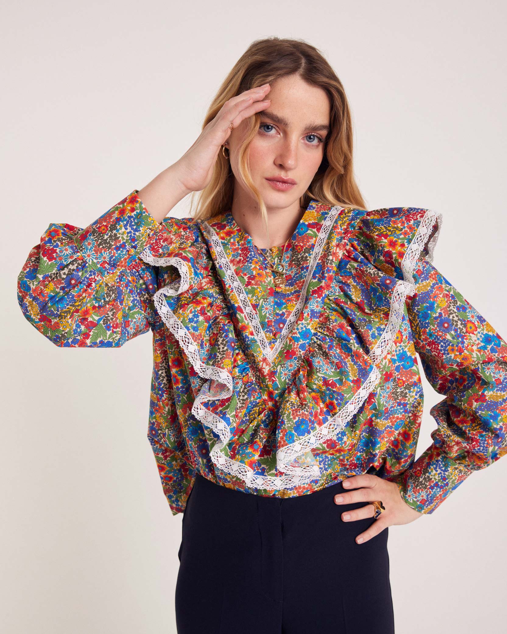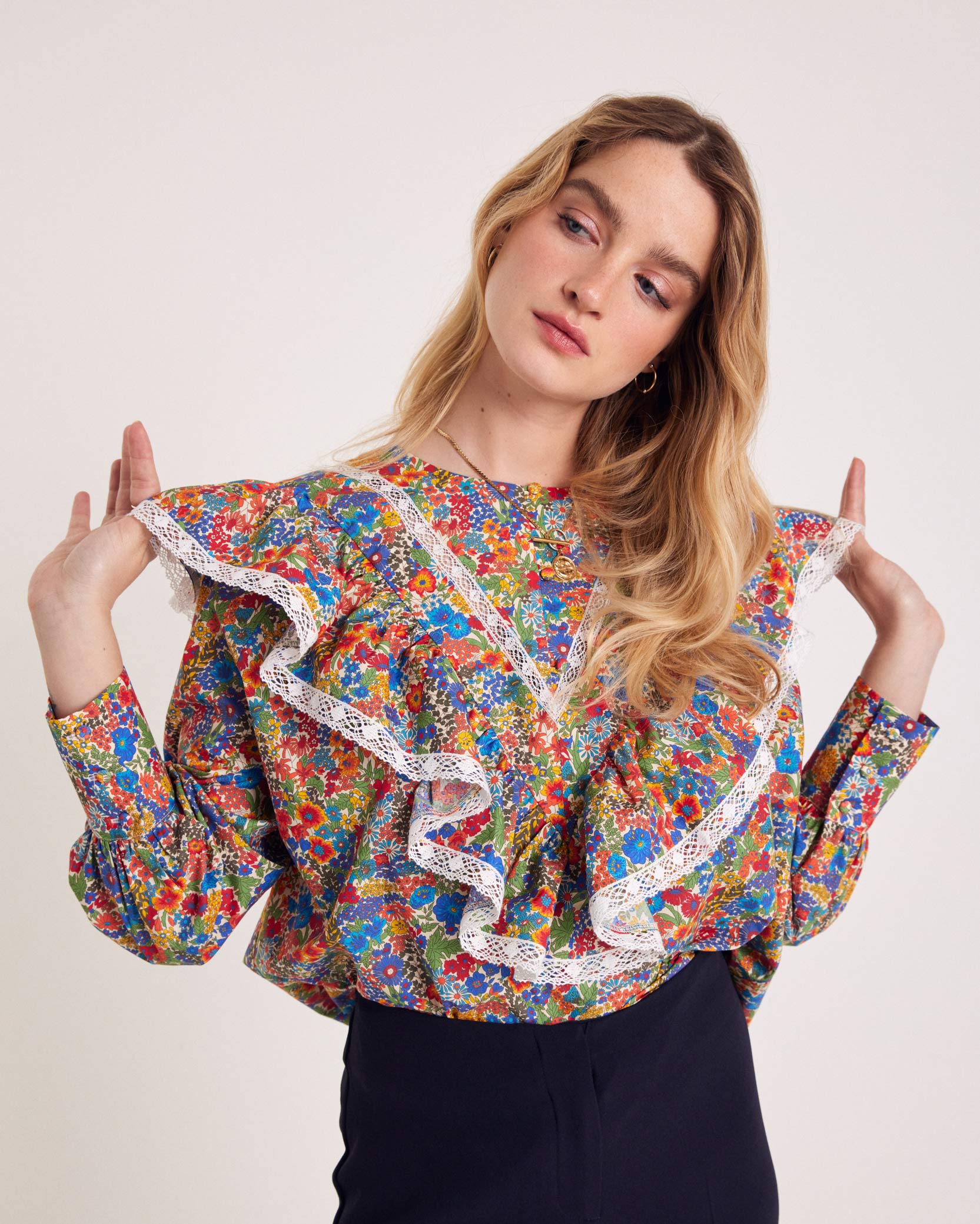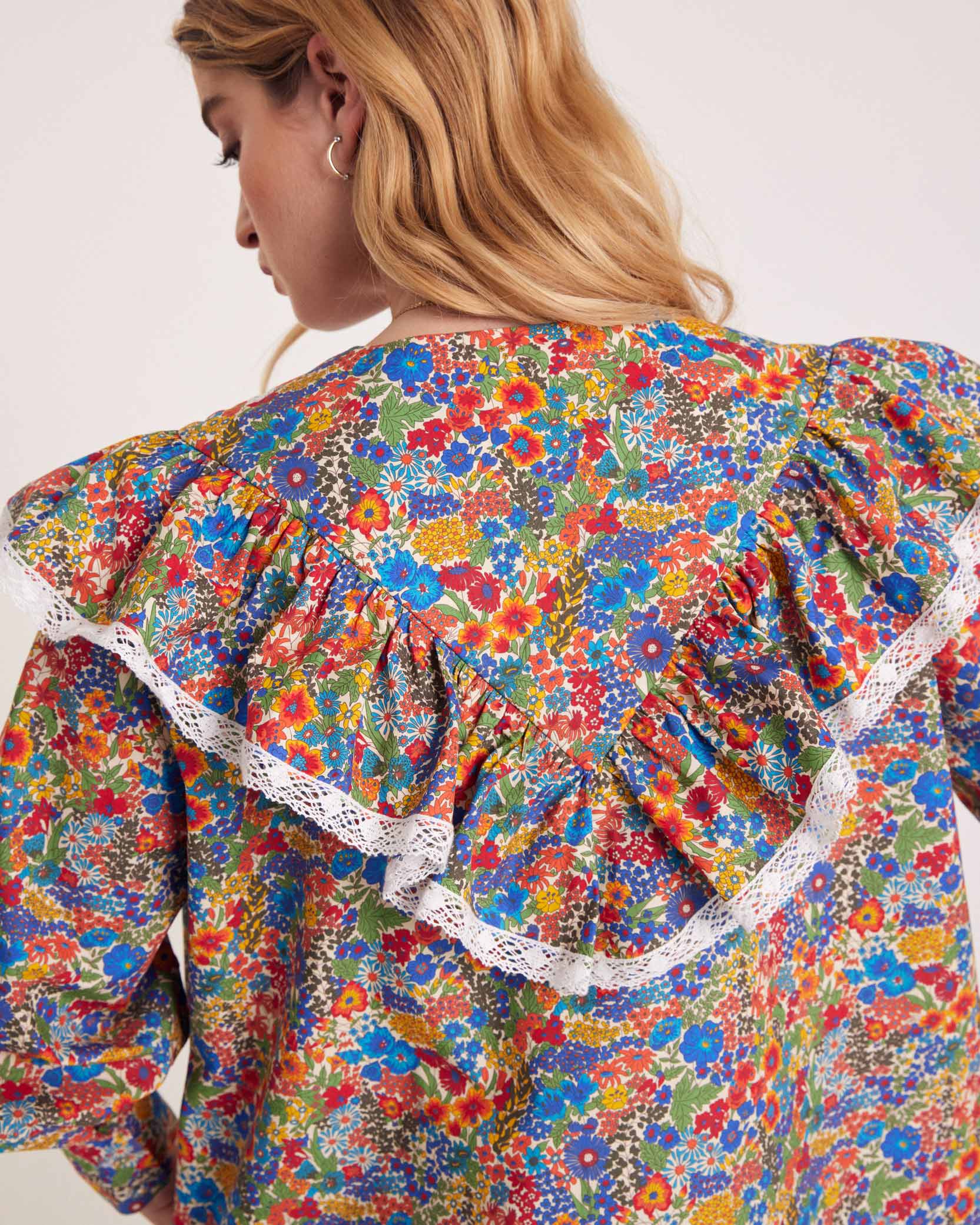 Un volume assumé avec ses grands volants froncés et ses incrustations en dentelle en forme de V, une encolure ronde et des manches légèrement bouffantes, sans oublier son iconique motif floral signé Liberty Fabrics. La blouse Azélie est empreinte d’élégance romantique, qui ne passe pas inaperçue !