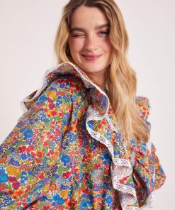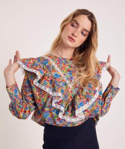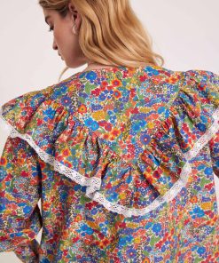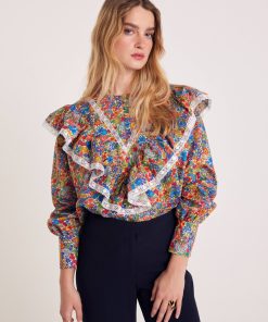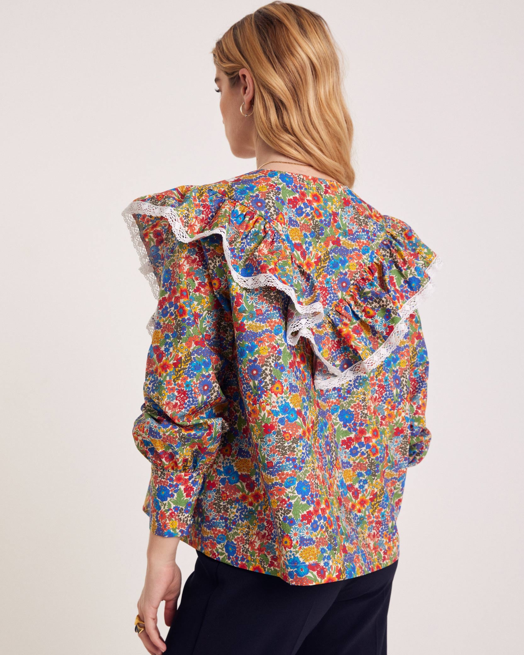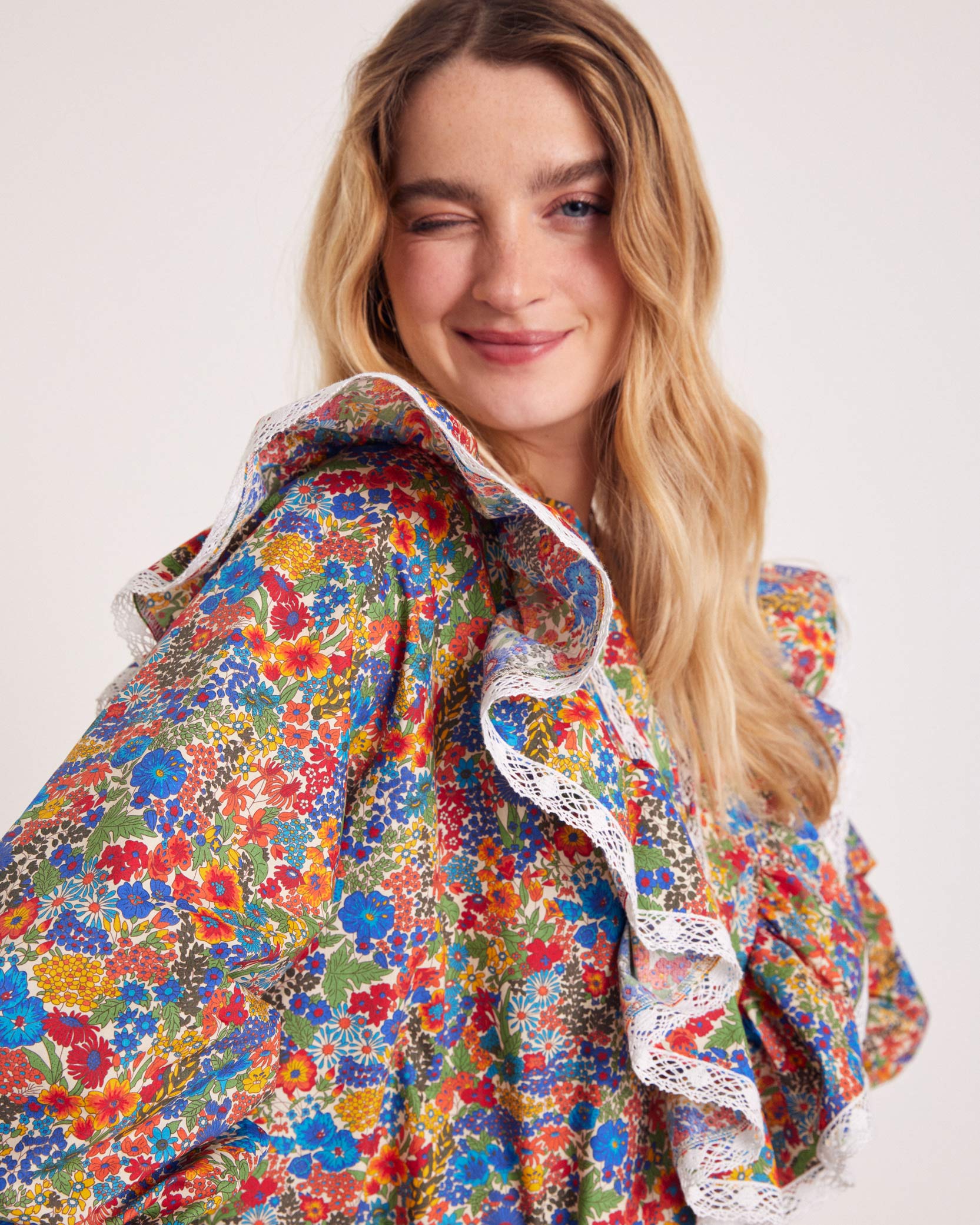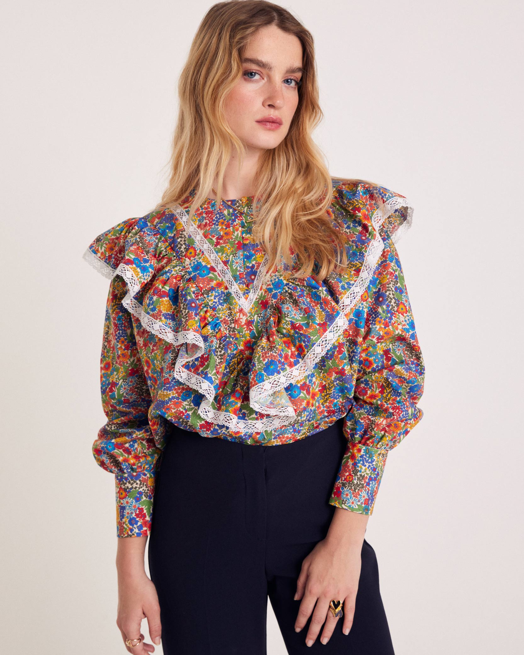 Un volume assumé avec ses grands volants froncés et ses incrustations en dentelle en forme de V, une encolure ronde et des manches légèrement bouffantes, sans oublier son iconique motif floral signé Liberty Fabrics. La blouse Azélie est empreinte d’élégance romantique, qui ne passe pas inaperçue !