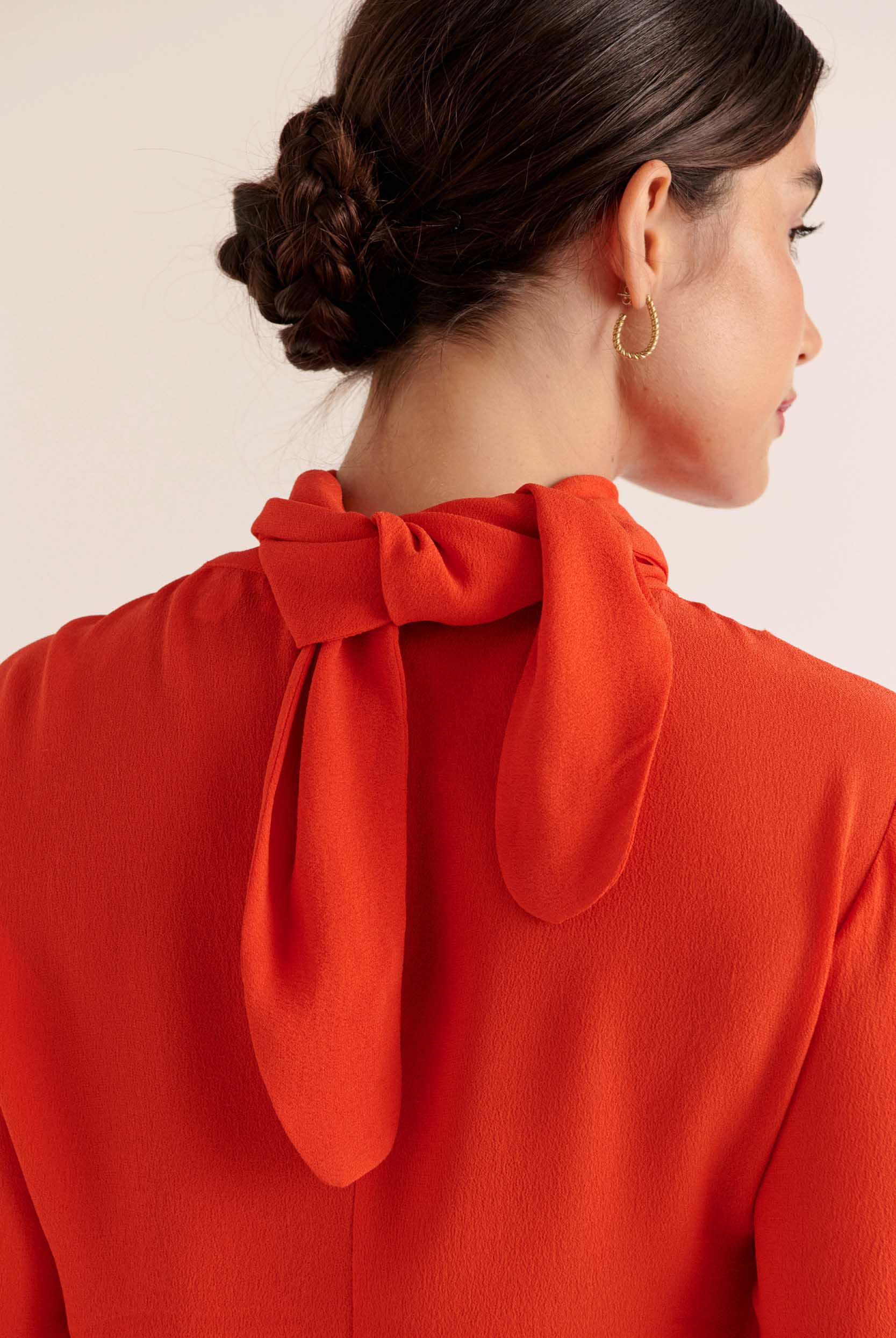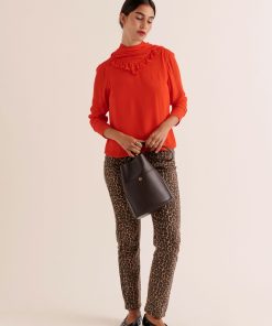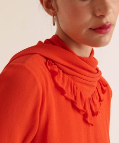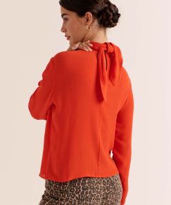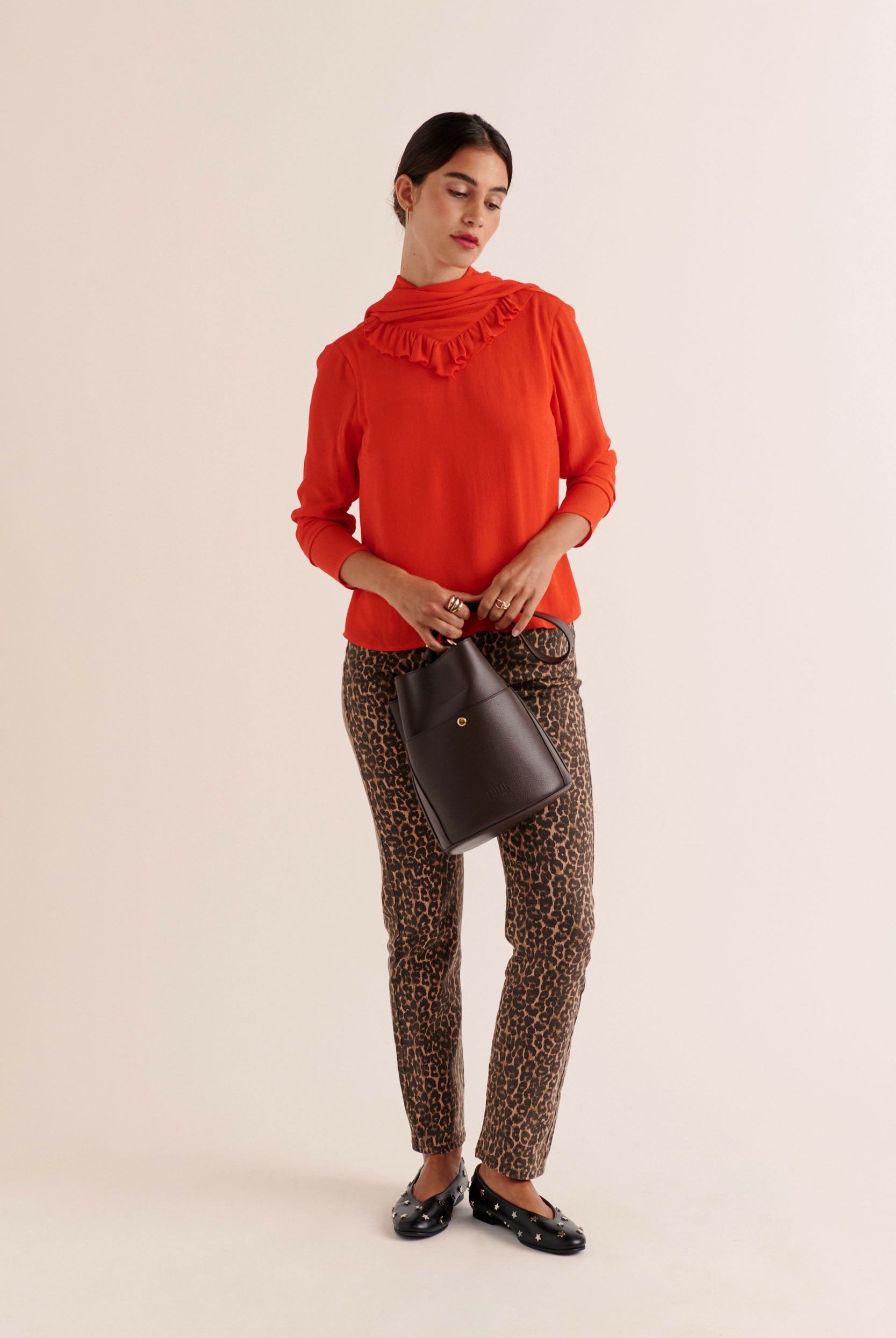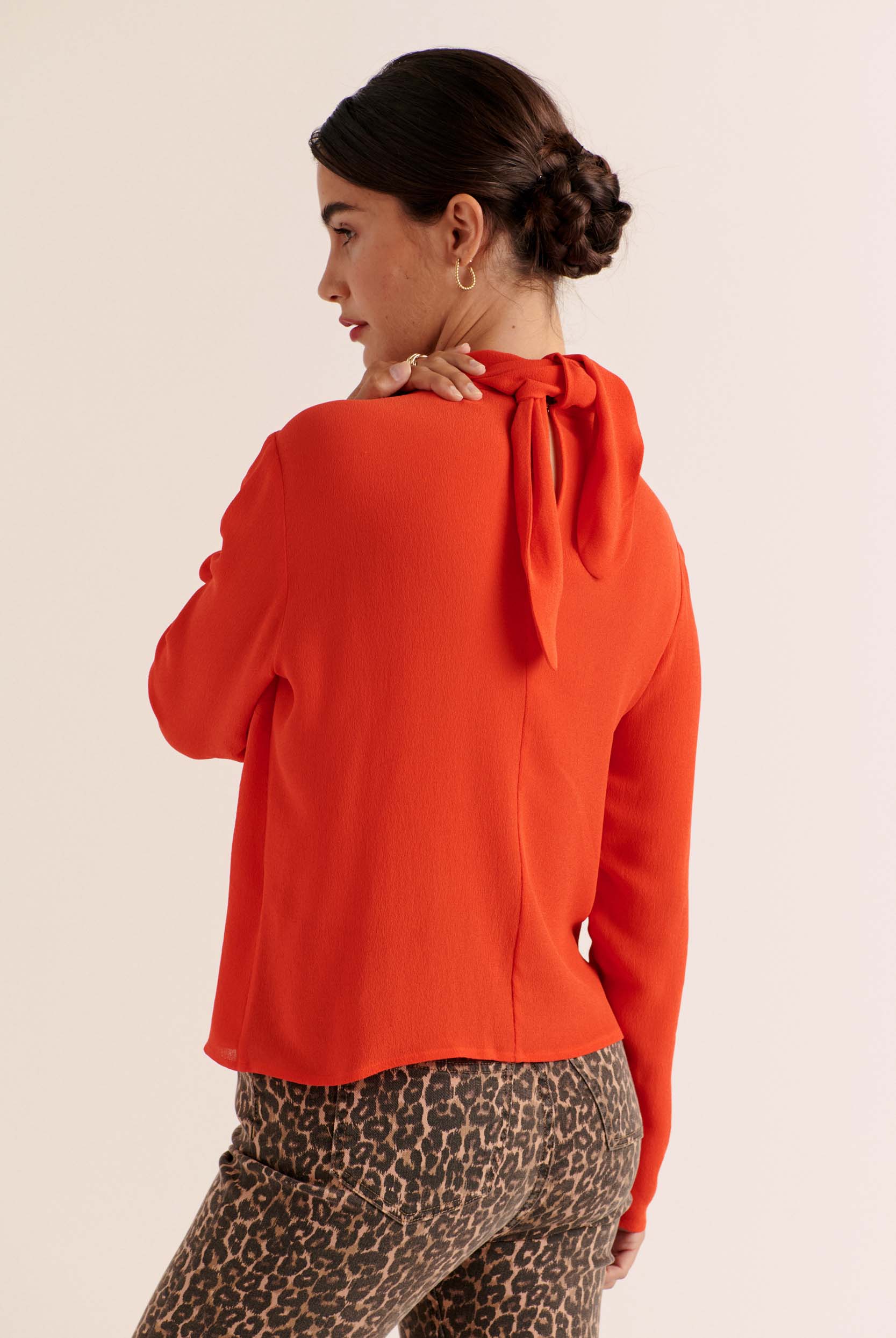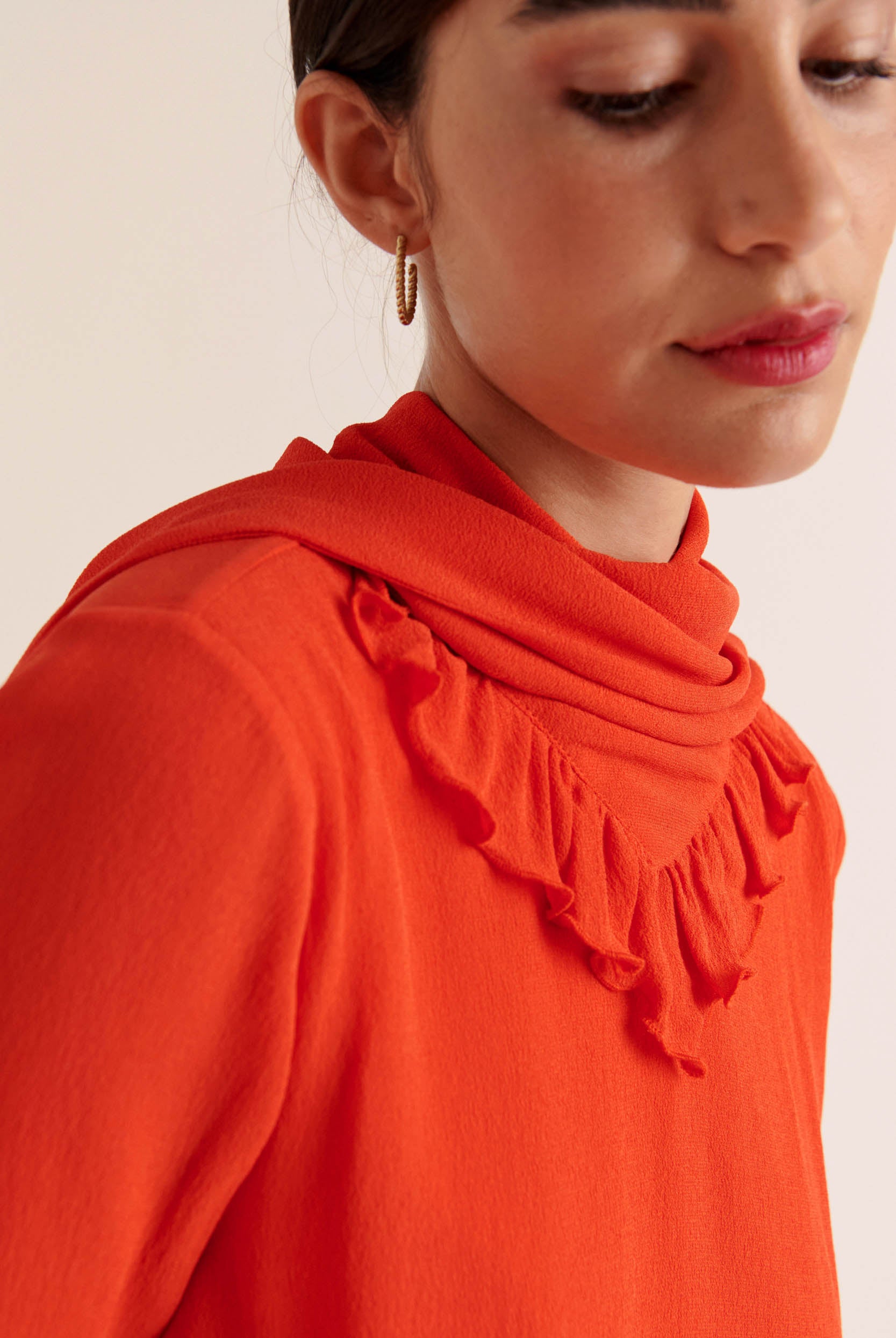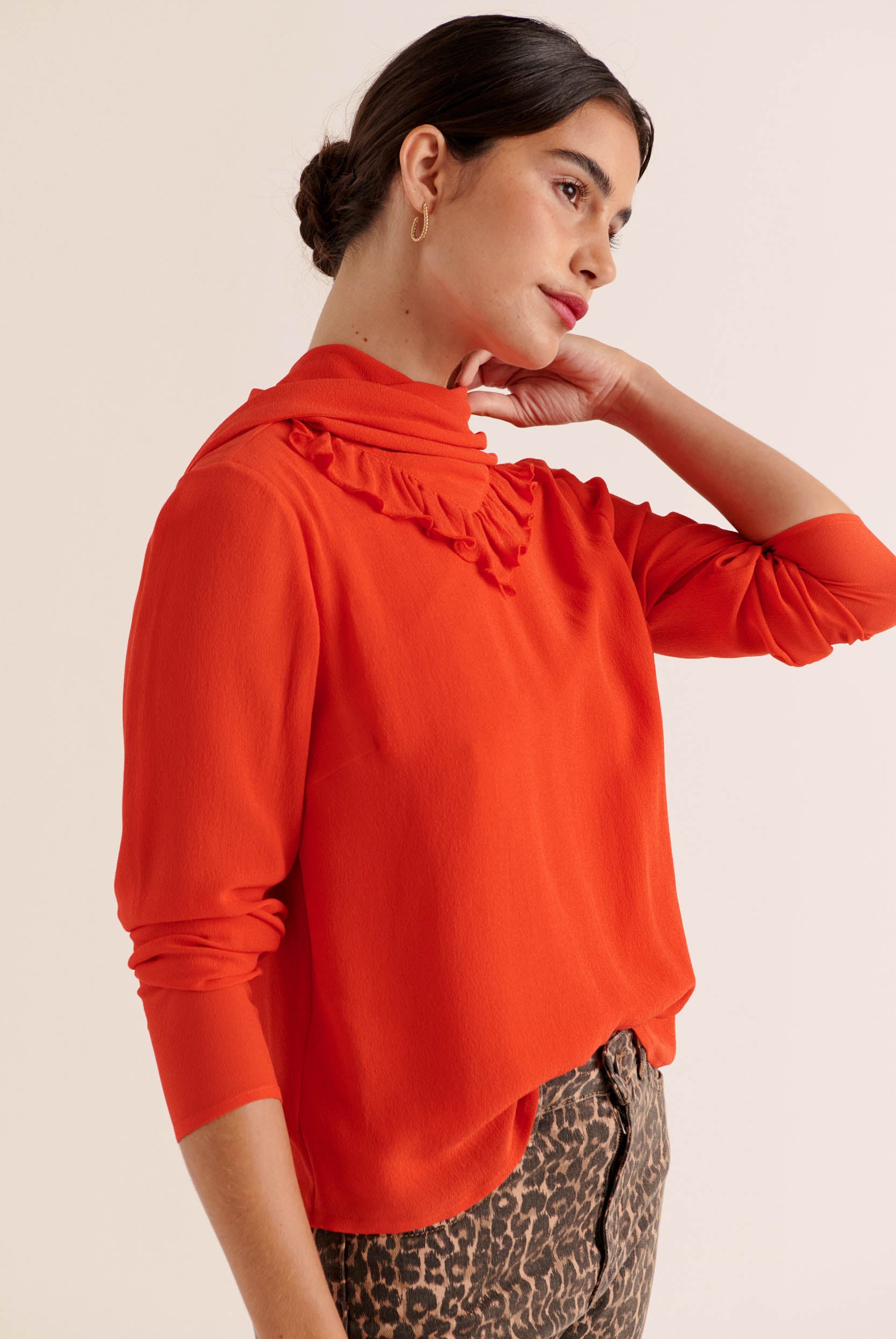 Laissez-vous séduire par la blouse Léontine orange. Nous adorons son col montant et son volant qui ajoutent une touche de fantaisie à cette pièce emblématique