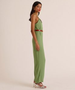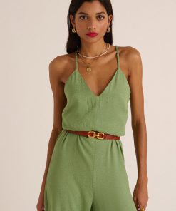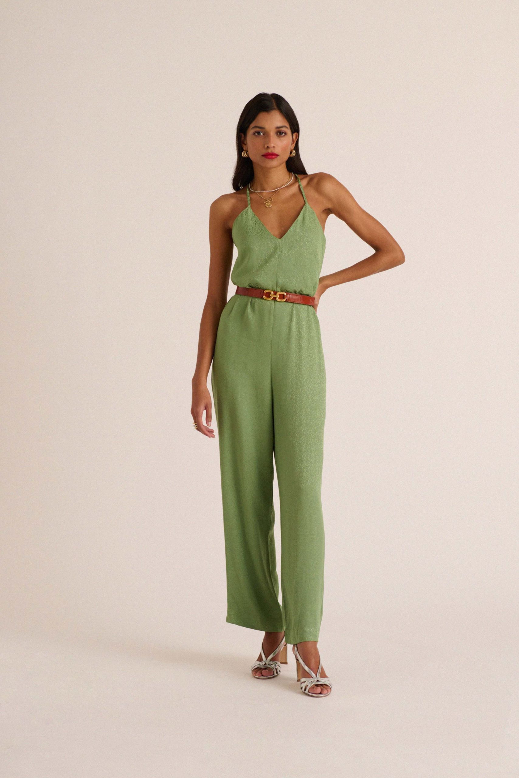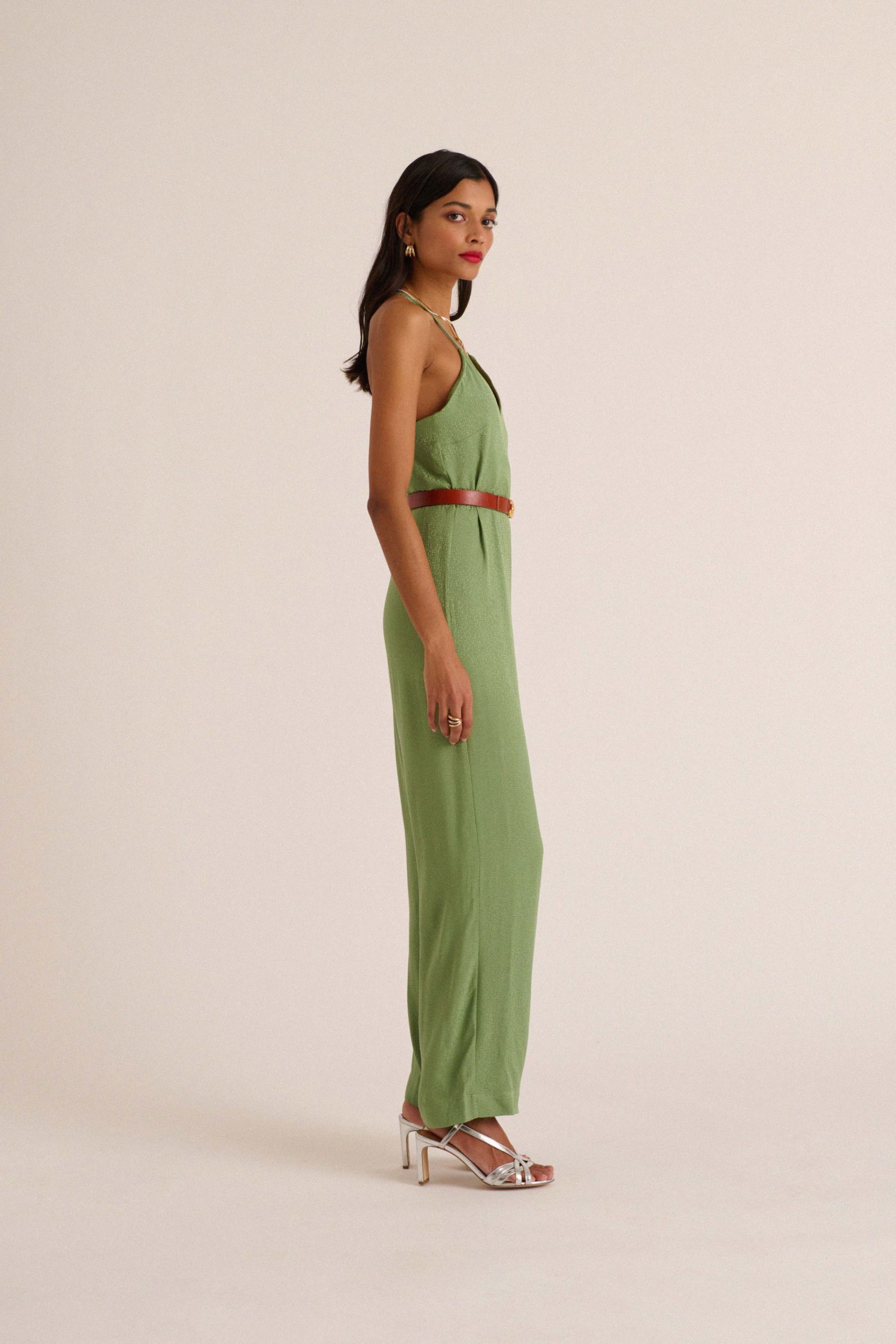 La combinaison Senteur vert sauge, idéale pour la saison estivale avec son dos croisé, sa coupe droite et sa couleur pastel.