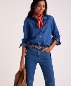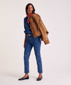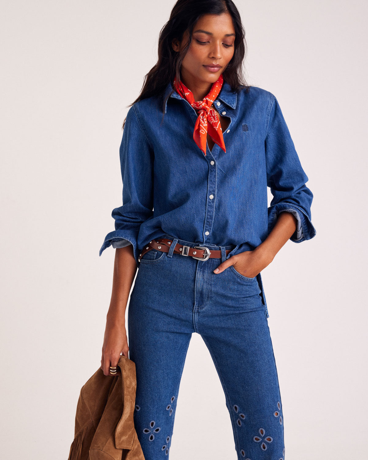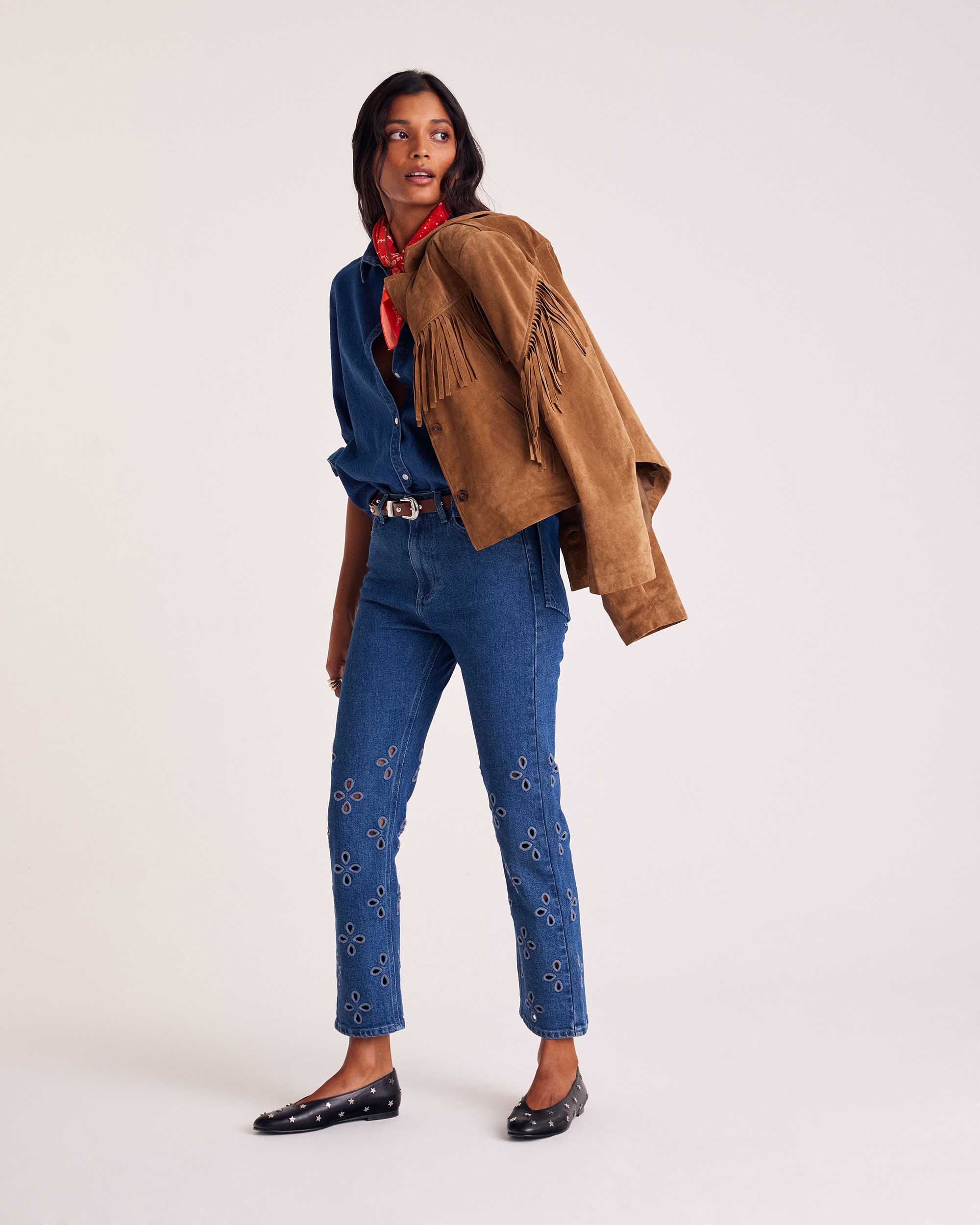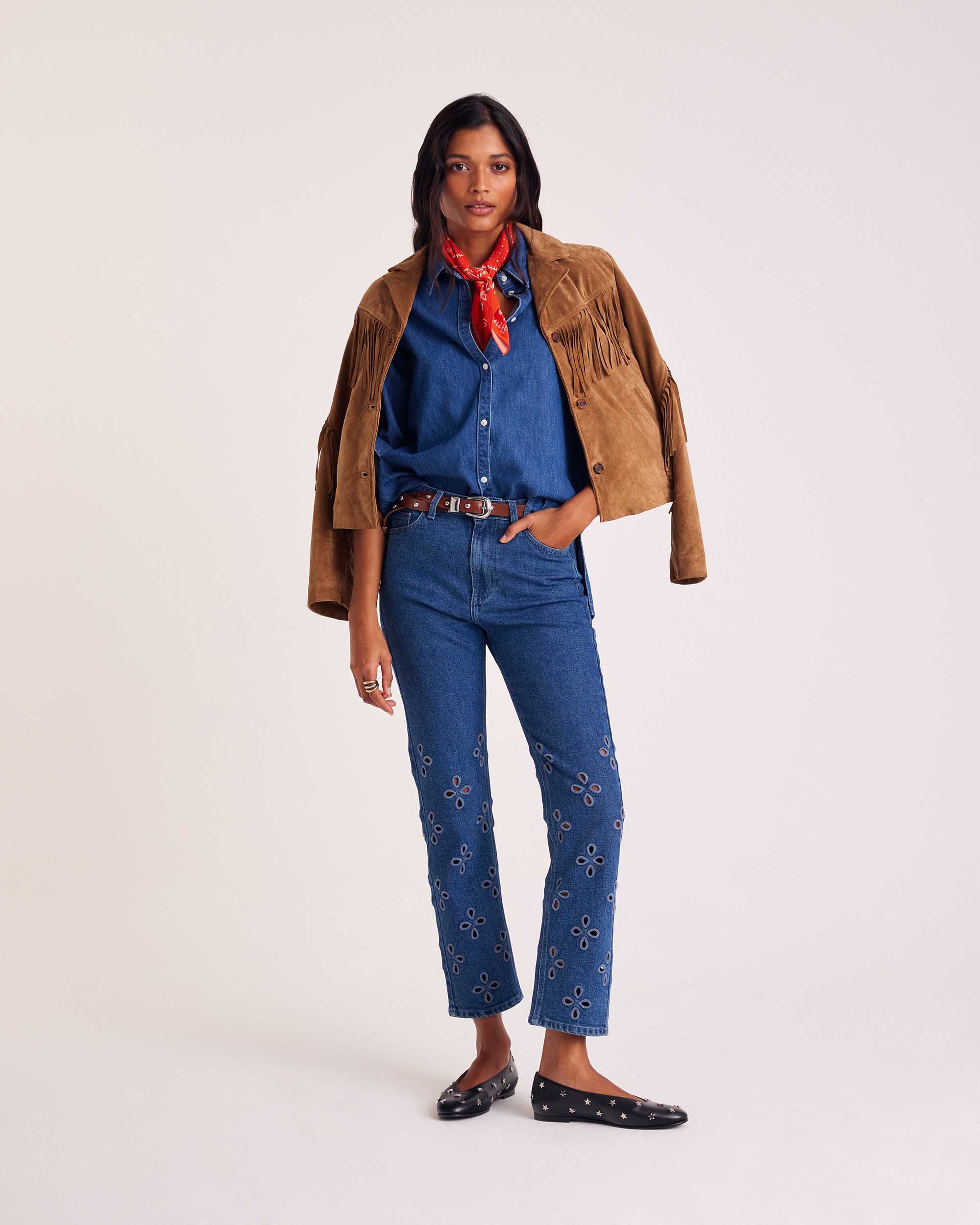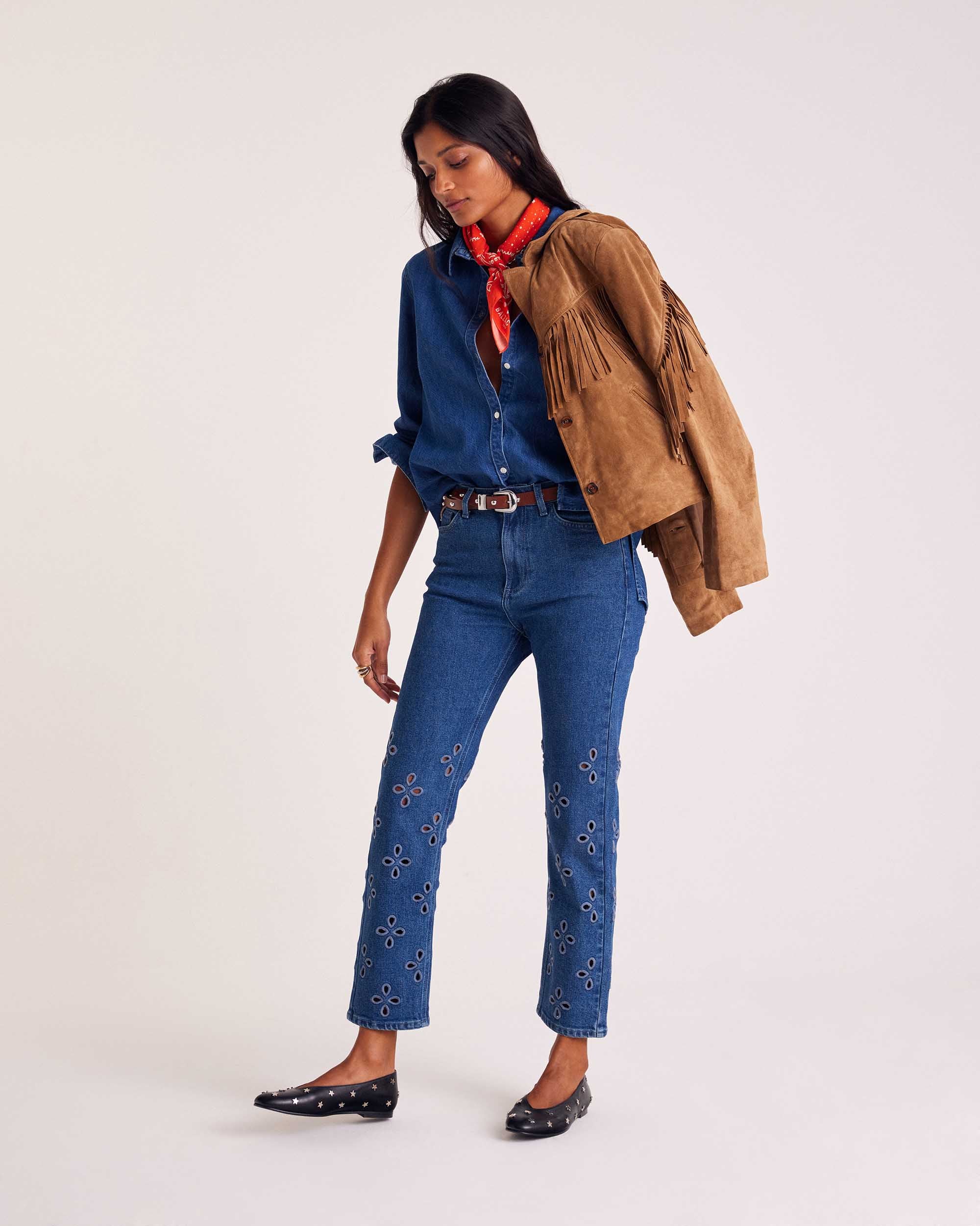 Emblématique et intemporel, le jean Austin se pare d’un bleu outremer brodé d’étoiles.