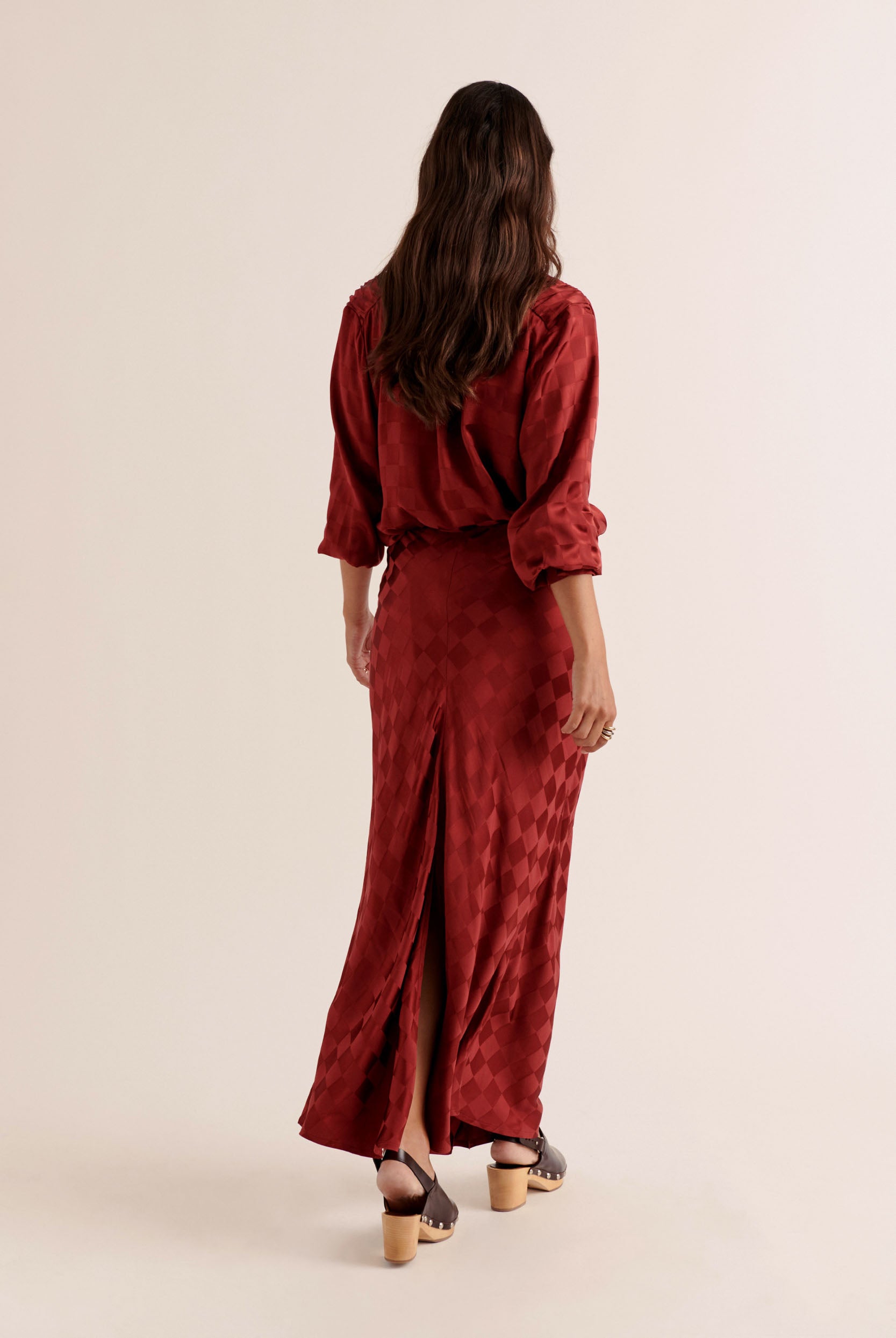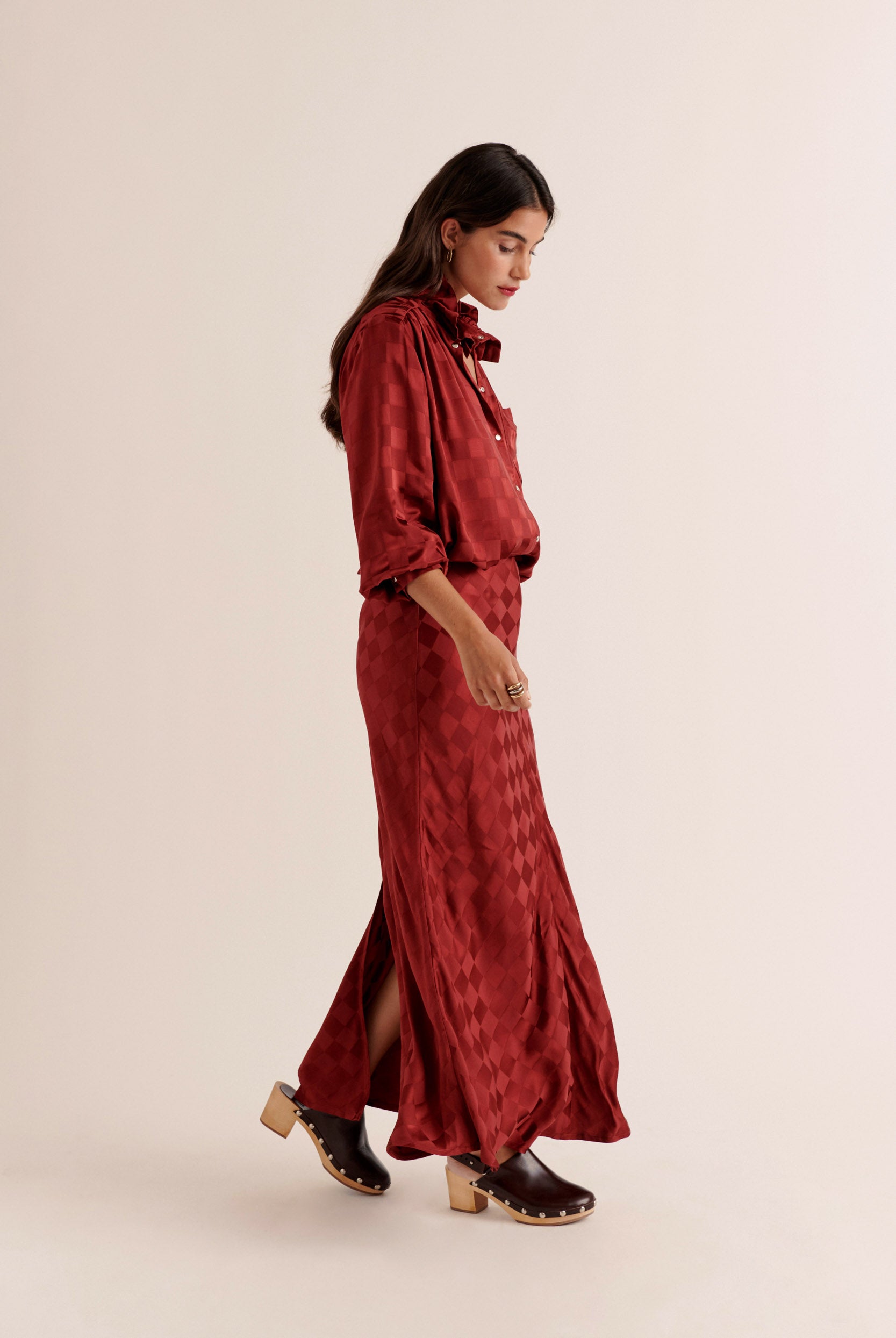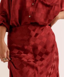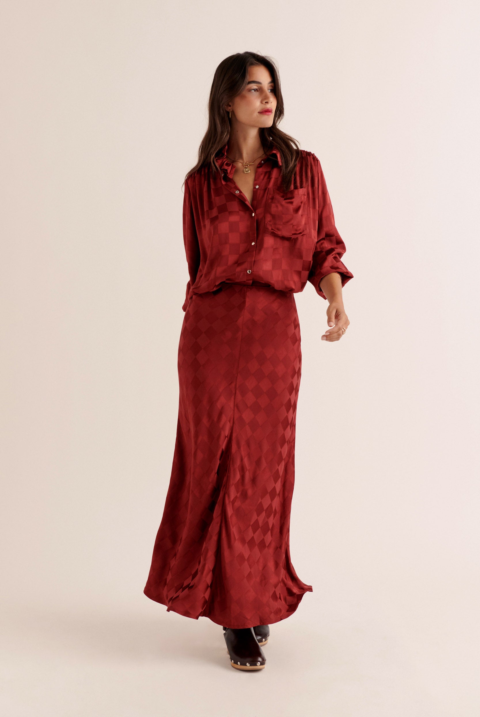 Avec sa matière fluide et son imprimé iconique, la jupe Ashley damier bordeaux est la pièce parfaite à porter à l’approche de la rentrée. Pour un total look, optez pour la chemise Léonor dans le même imprimé !