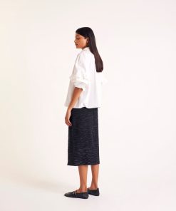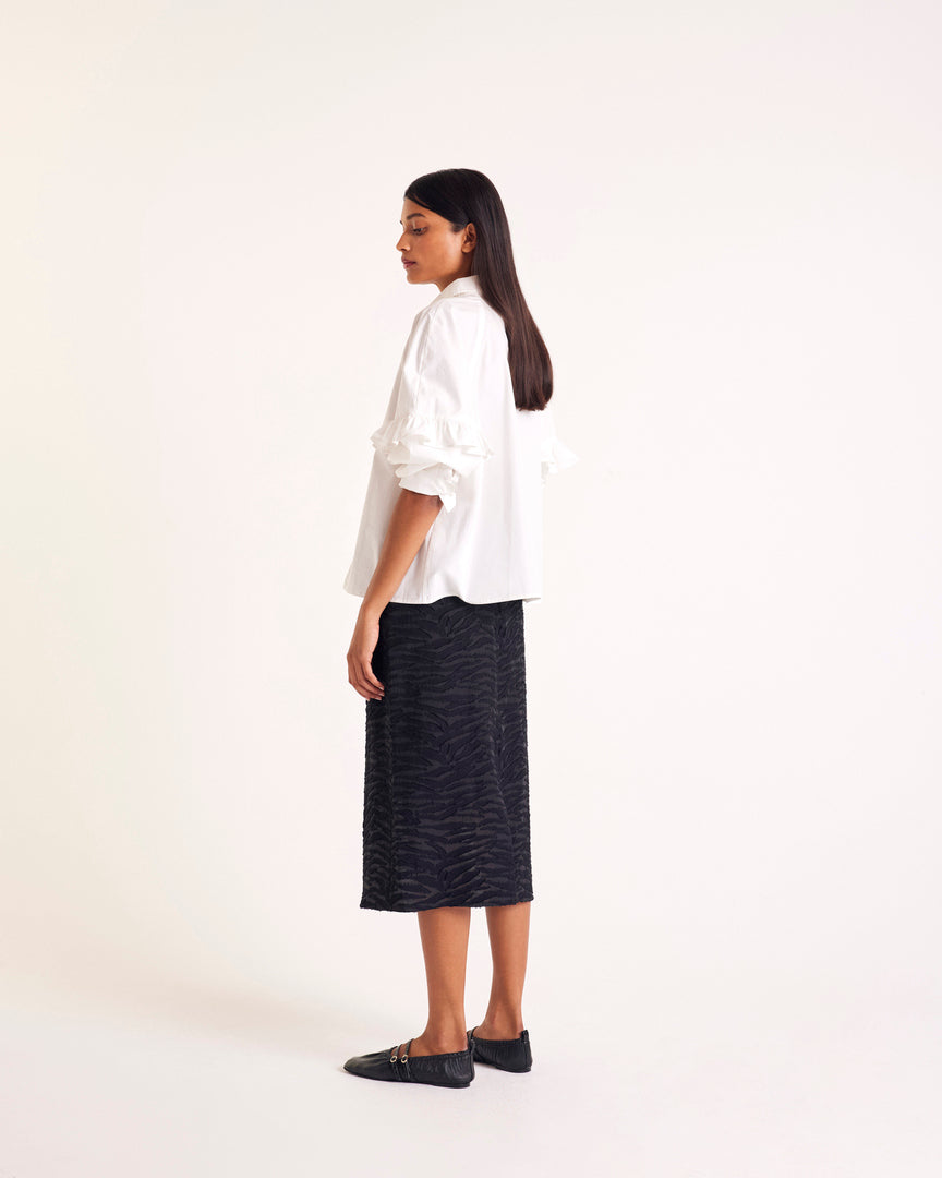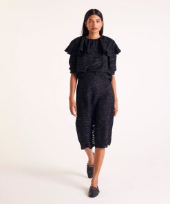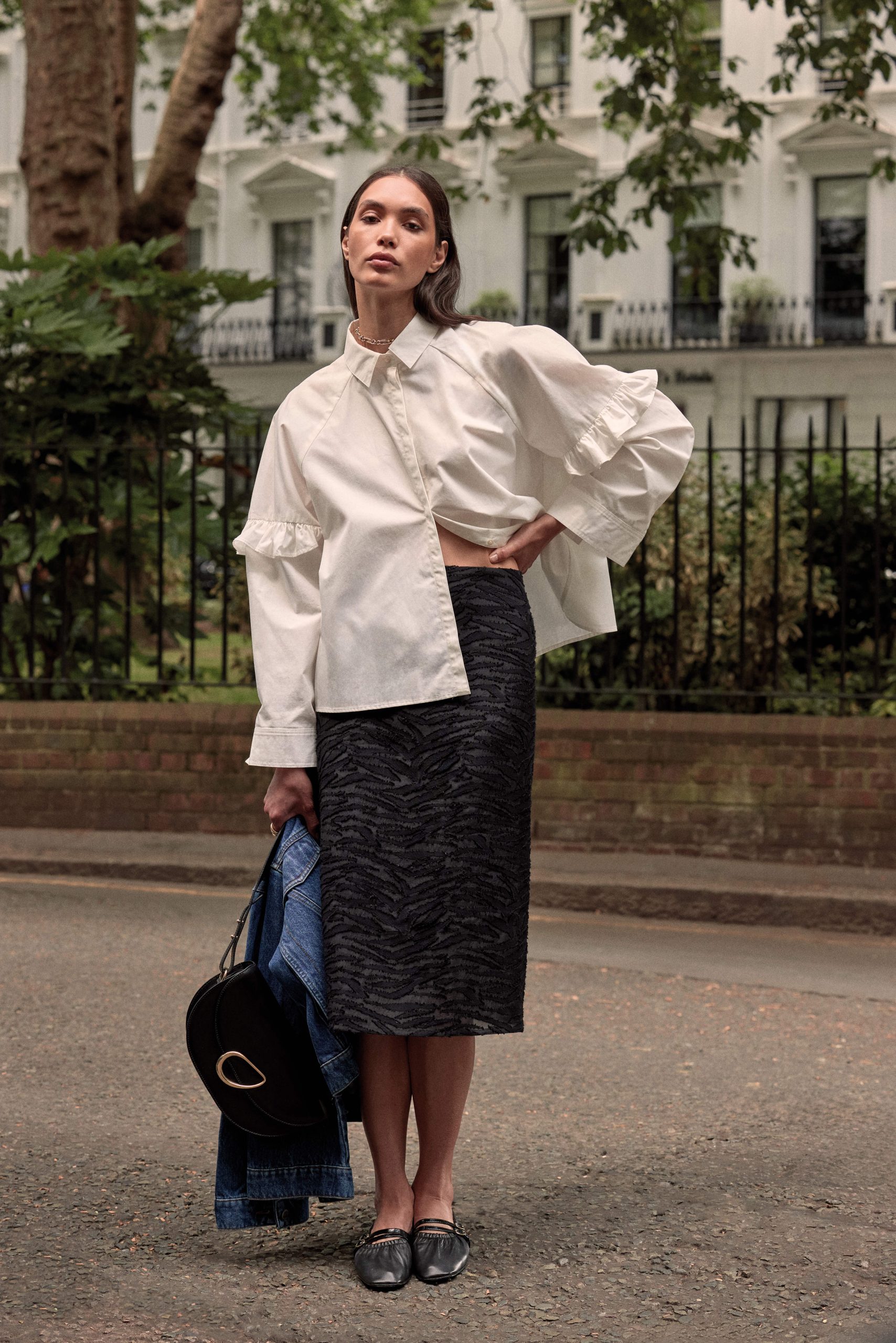 - Doublure volante qui ne va pas jusqu’au bas de la jambe pour jouer avec la transparence de la matière
