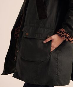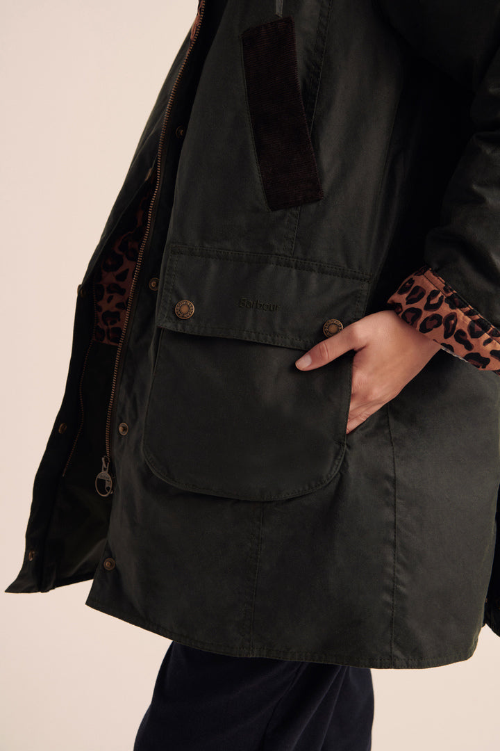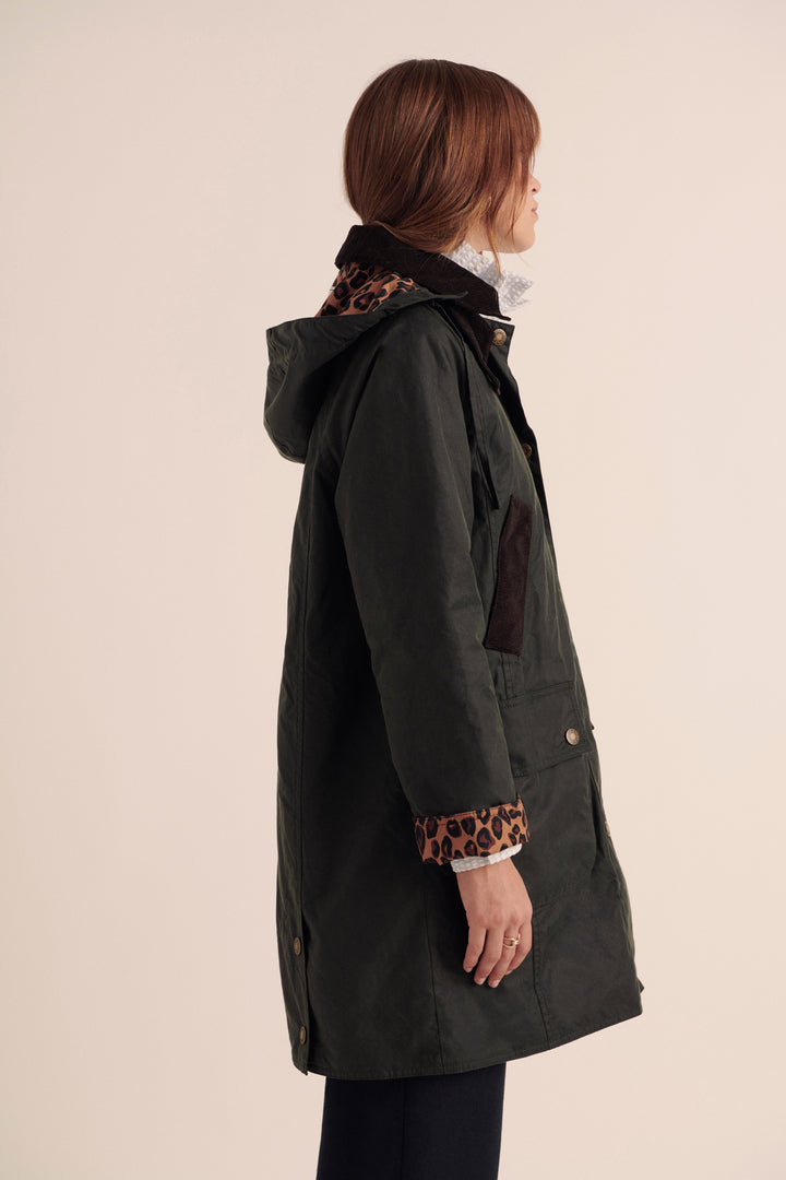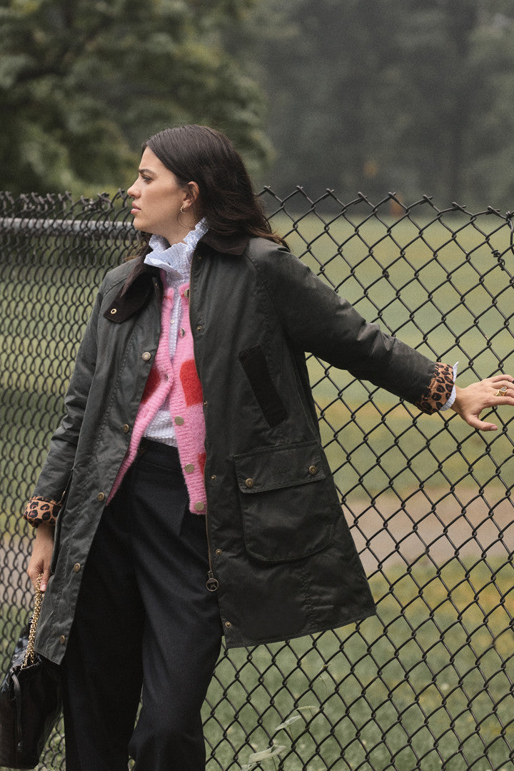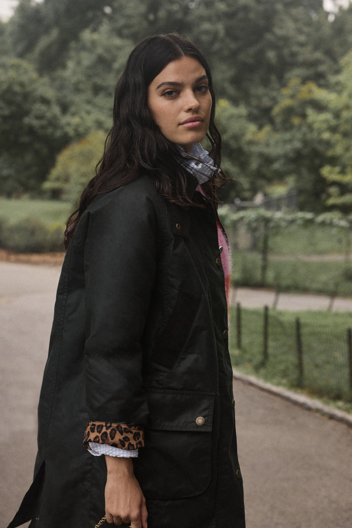 Un manteau iconique signé Barbour, dans une version plus longue et légèrement oversized, paré de l’imprimé léopard signature de Balzac Paris.