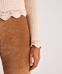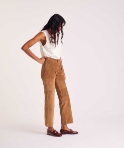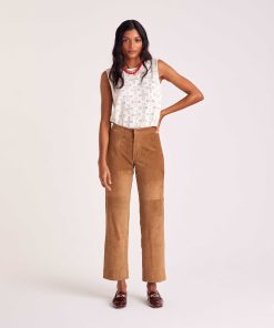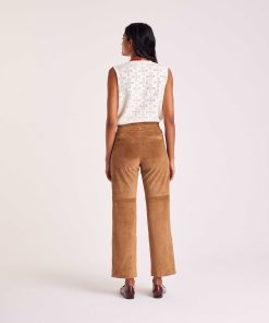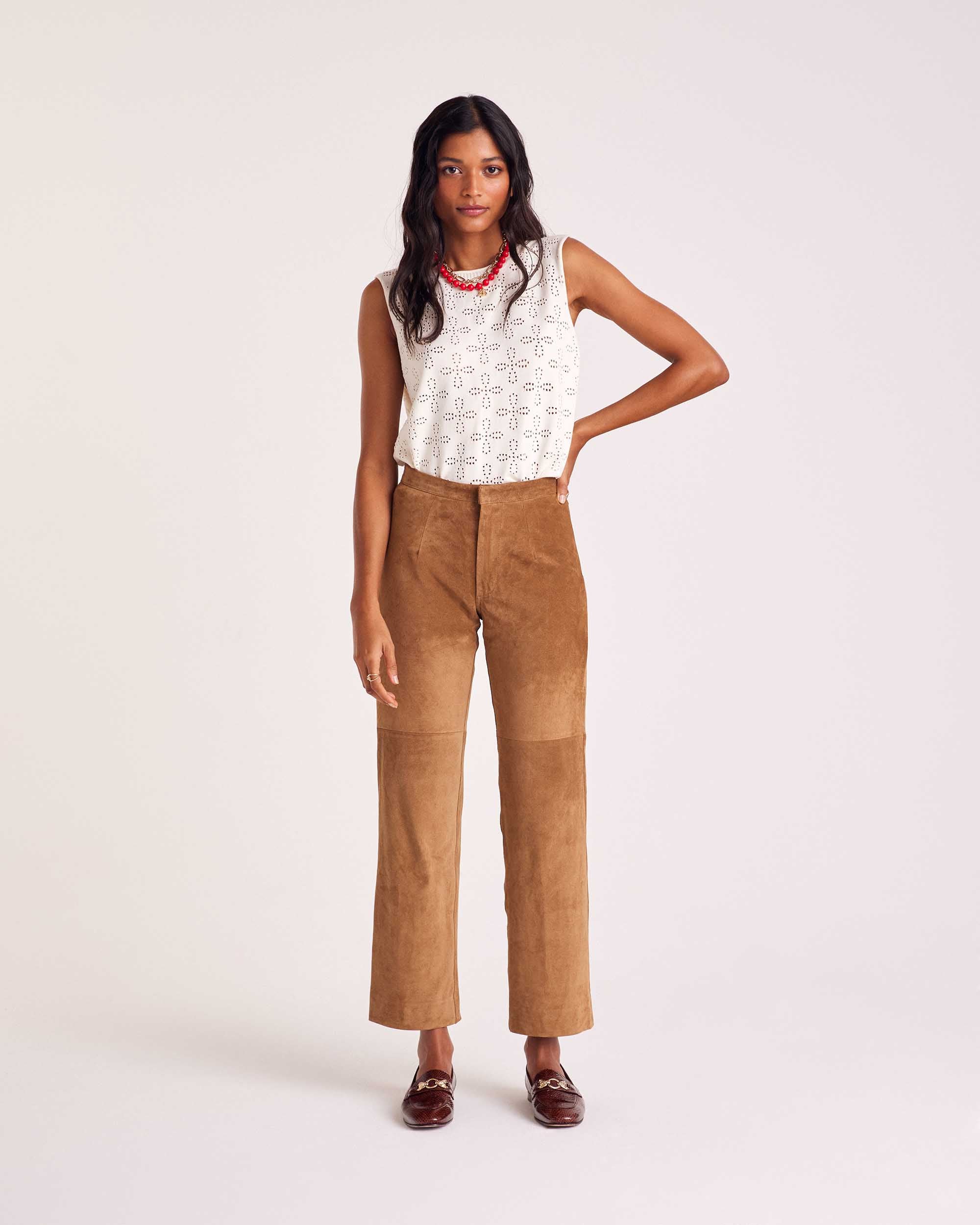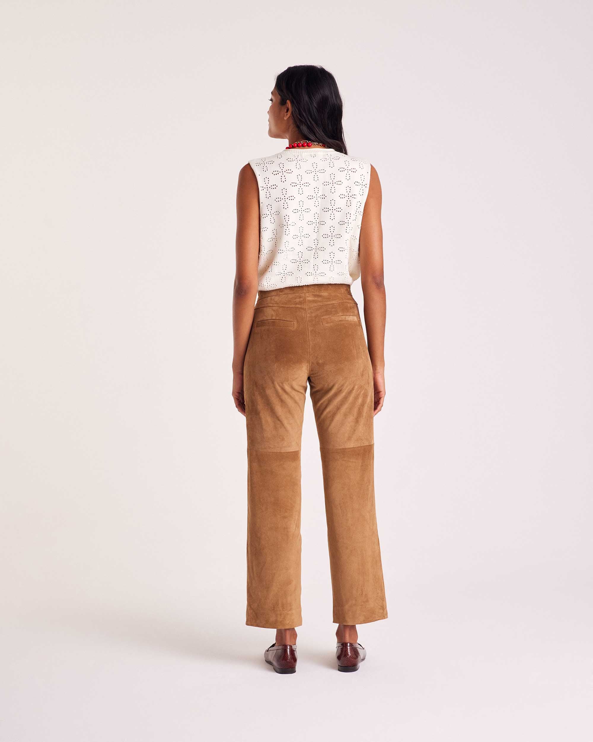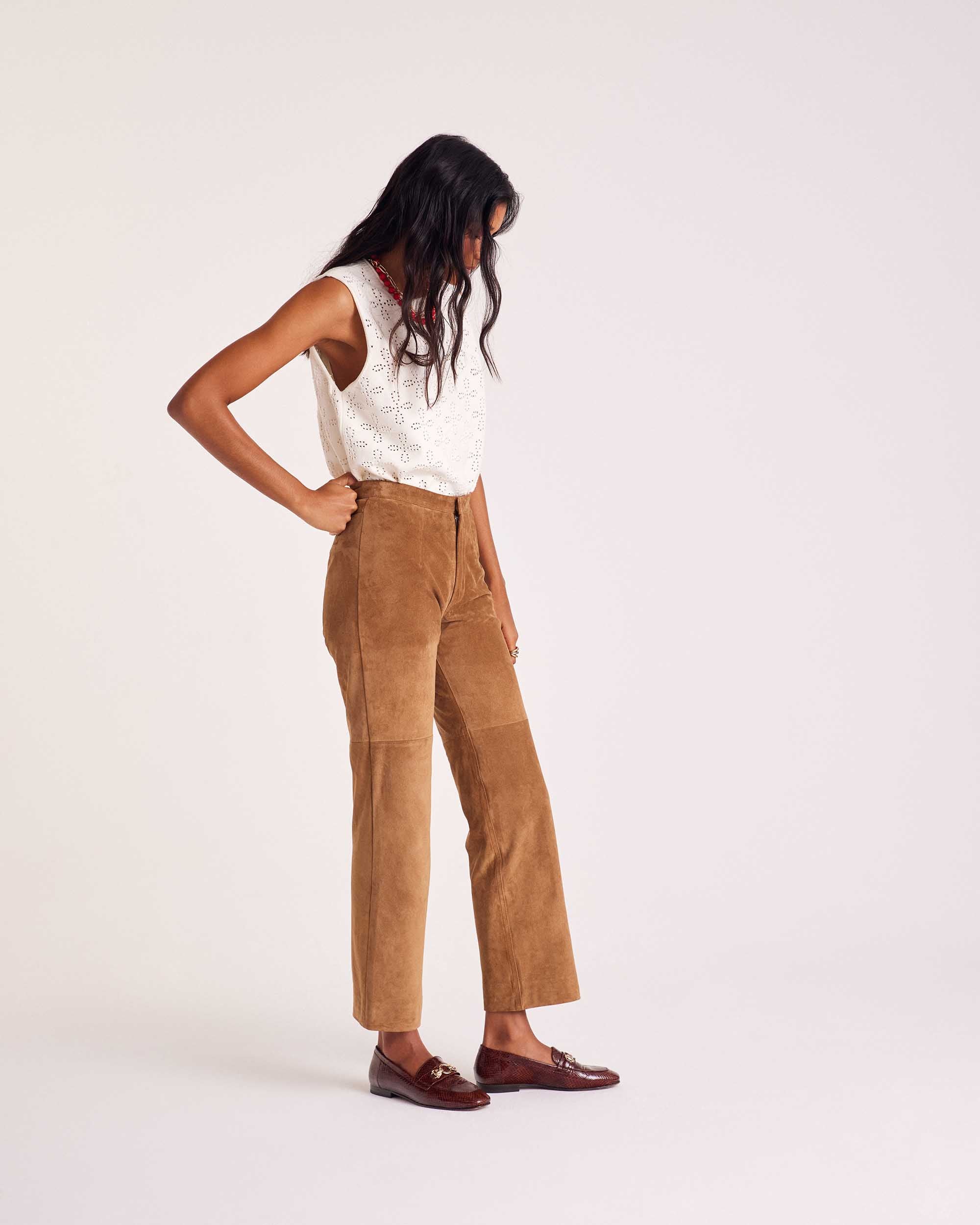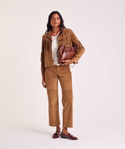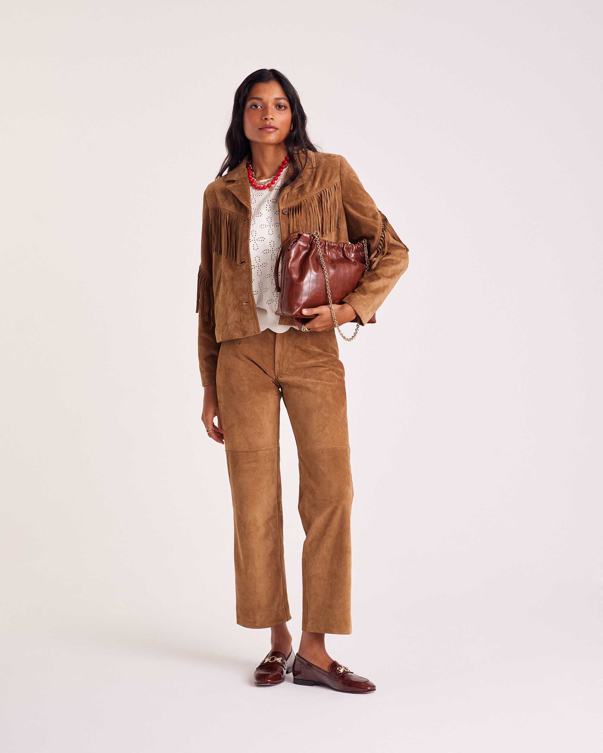 Variante de notre veste Serena en cuir lisse bordeaux, cette version en cuir de veau camel apporte une touche lumineuse aux tenues. Inspirée des vestes tailleur par son col classique, elle se distingue par ses franges qui lui donnent une allure de cow-boy chic. À dépareiller ou à assortir avec le pantalon Selby pour un look audacieux.