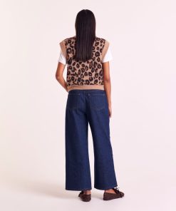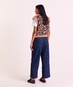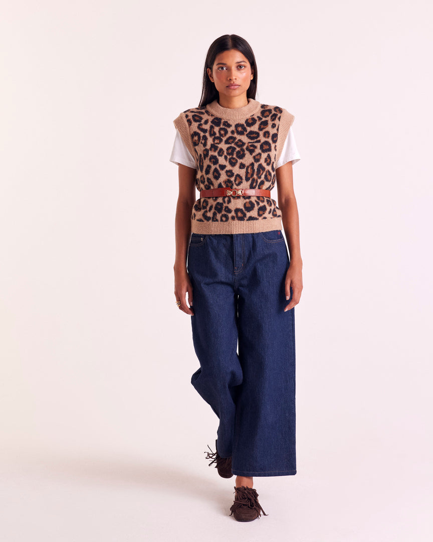 Pull sans manches léopard, très doux. À porter à même la peau ou sur une chemise blanche, il twiste une tenue en un clin d’œil.