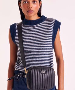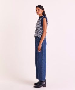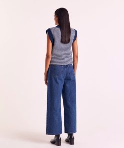 Pull sans manches rayures marine et blanc, très doux. À porter à même la peau ou sur une chemise blanche, il twiste une tenue en un clin d’œil.