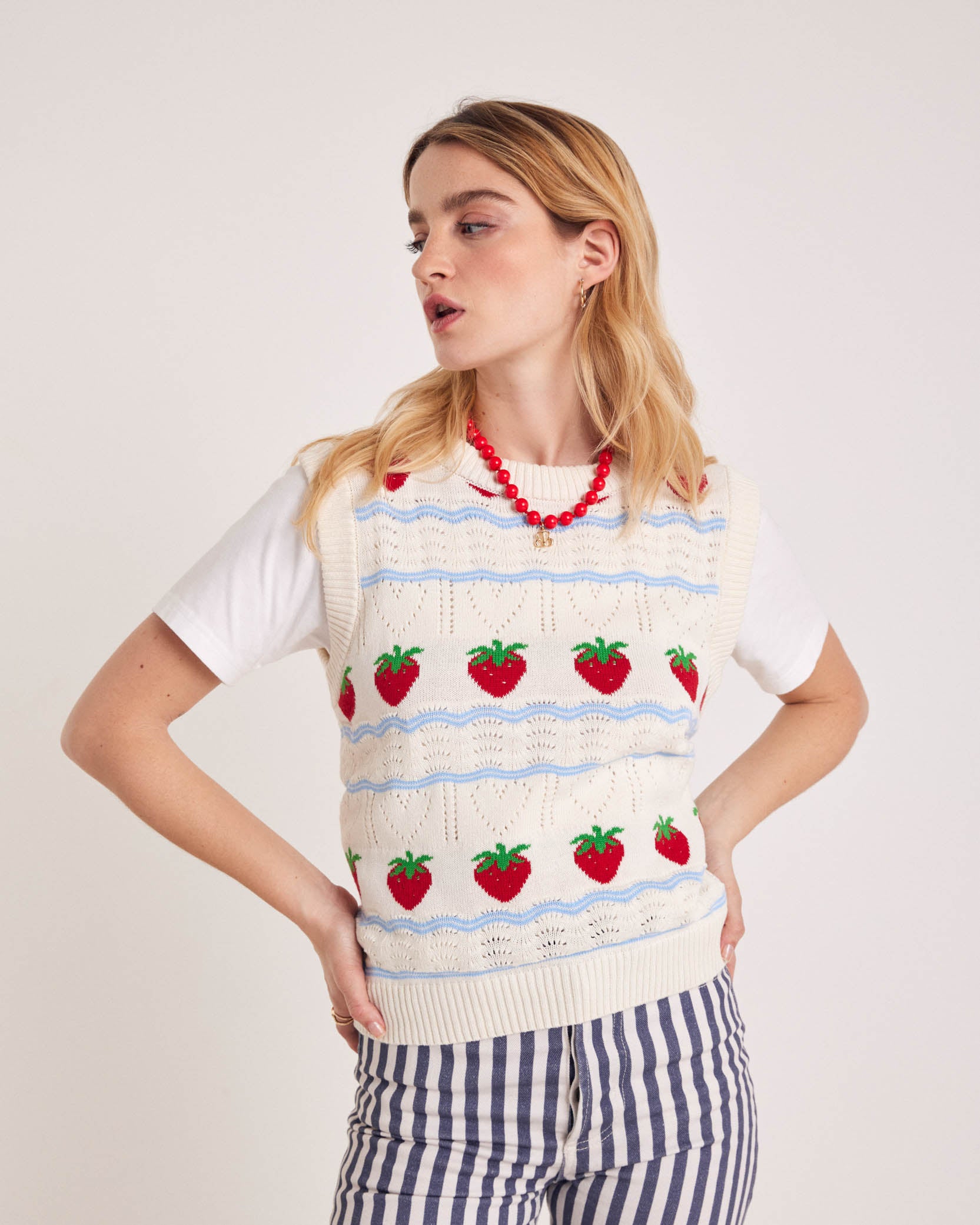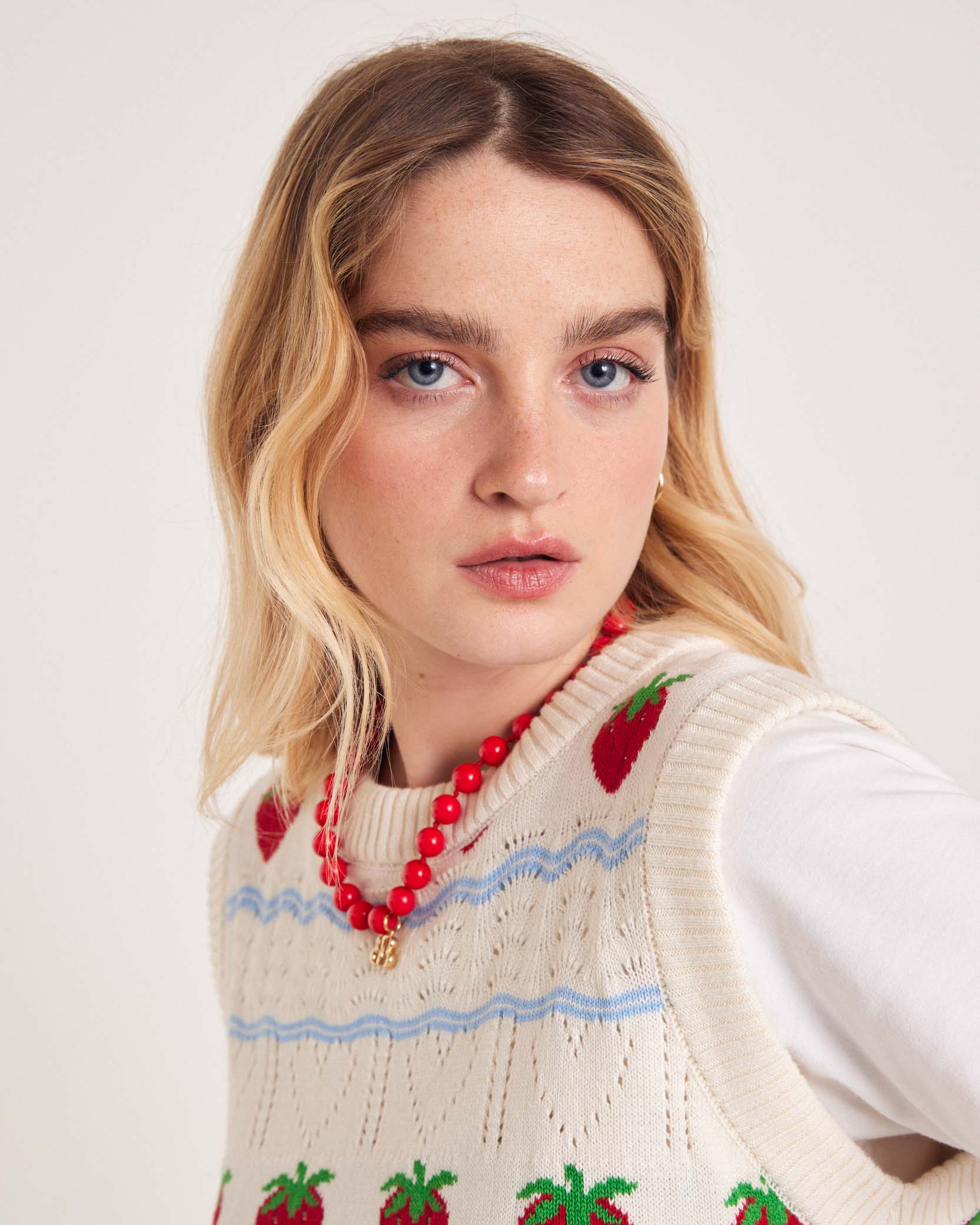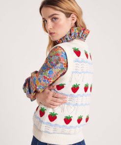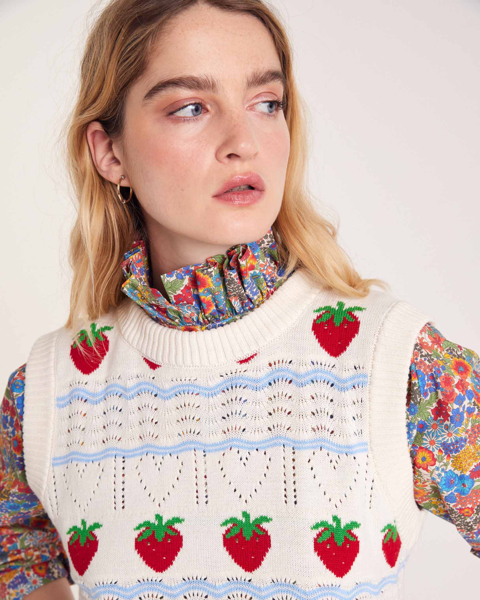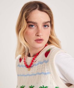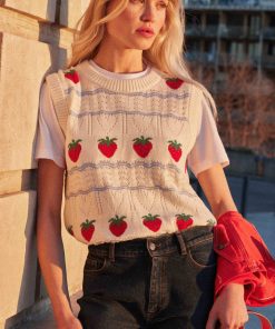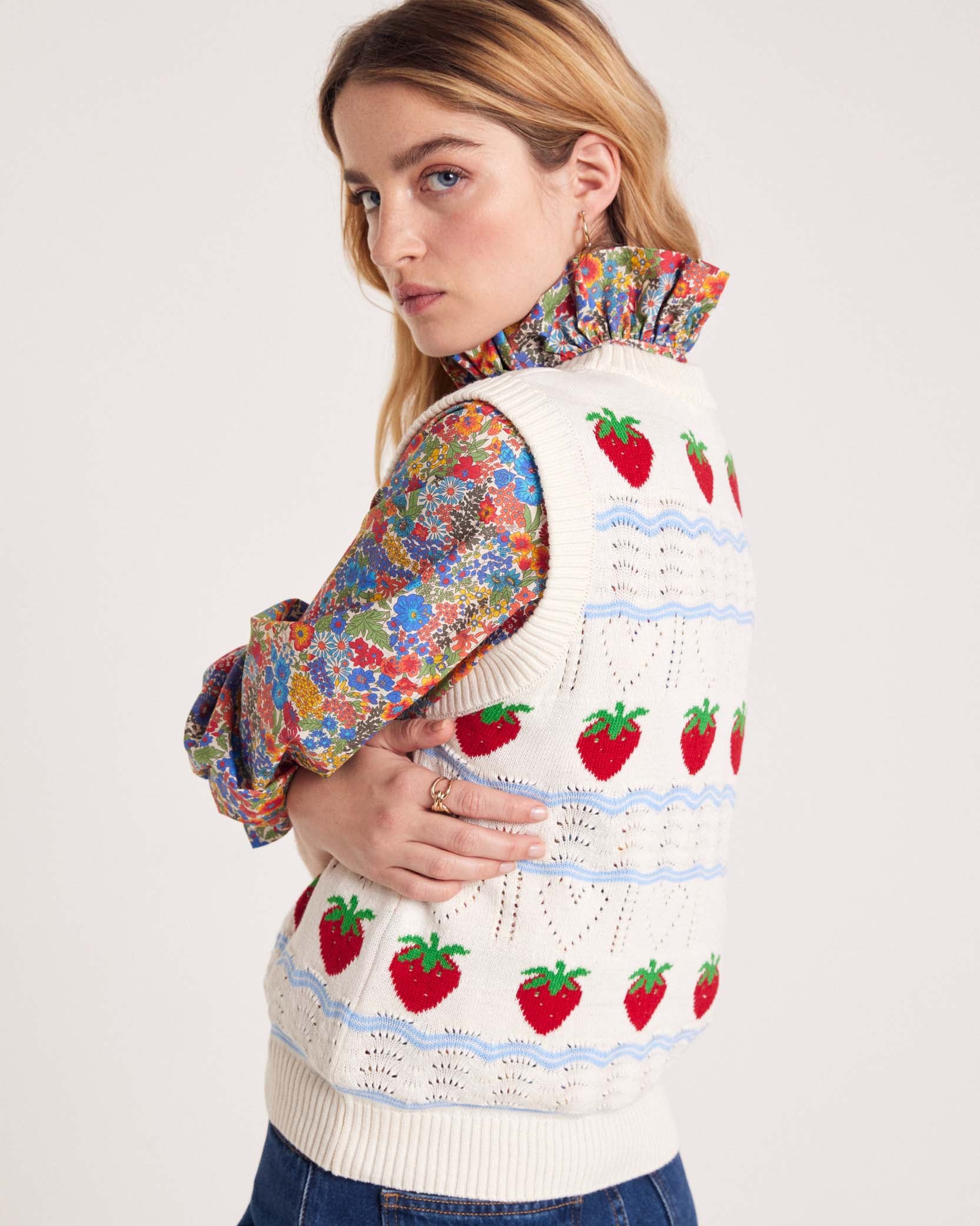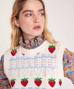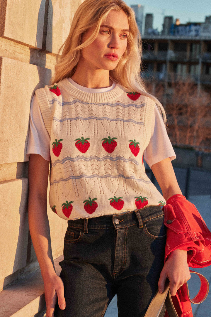 On est complètement fan du pull sans manches Priska avec ses fraises brodées, il vient twister et apporter une touche vintage à vos tenues.