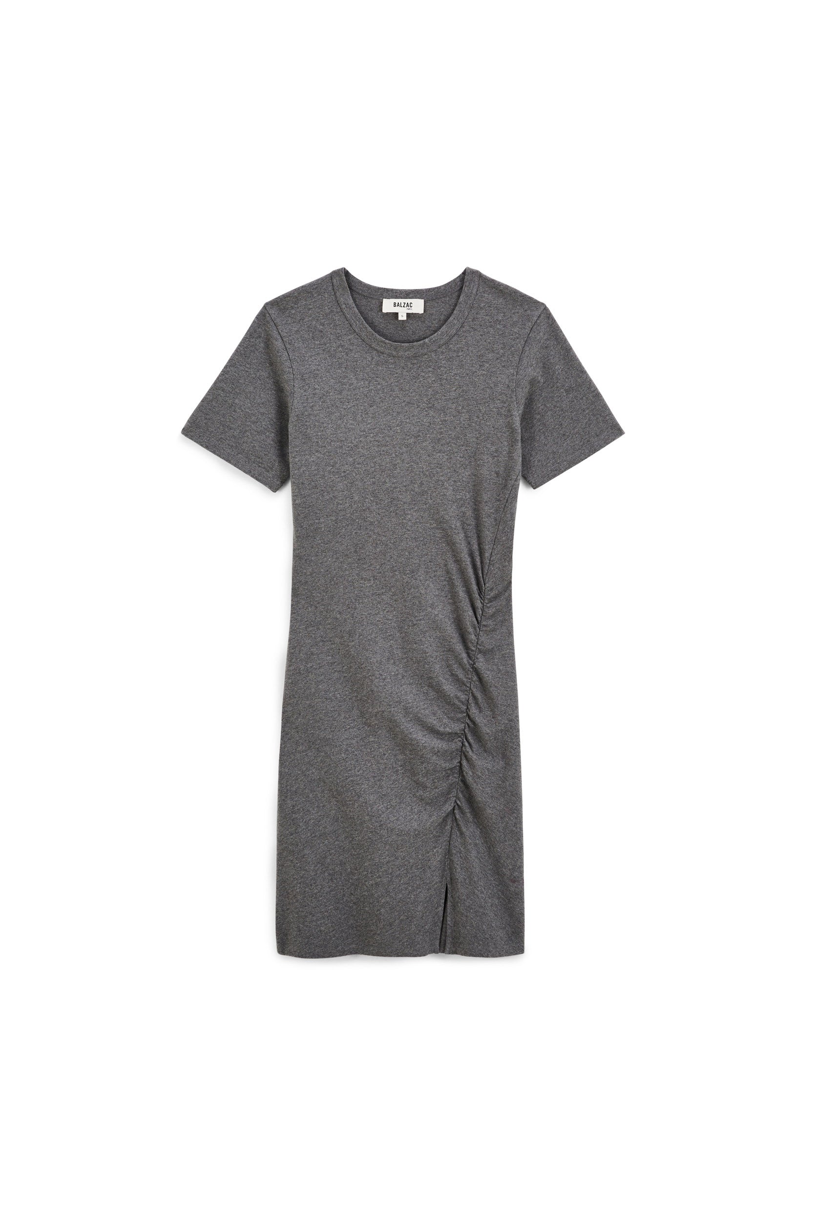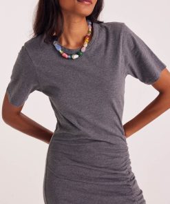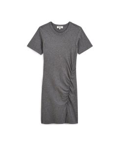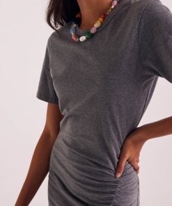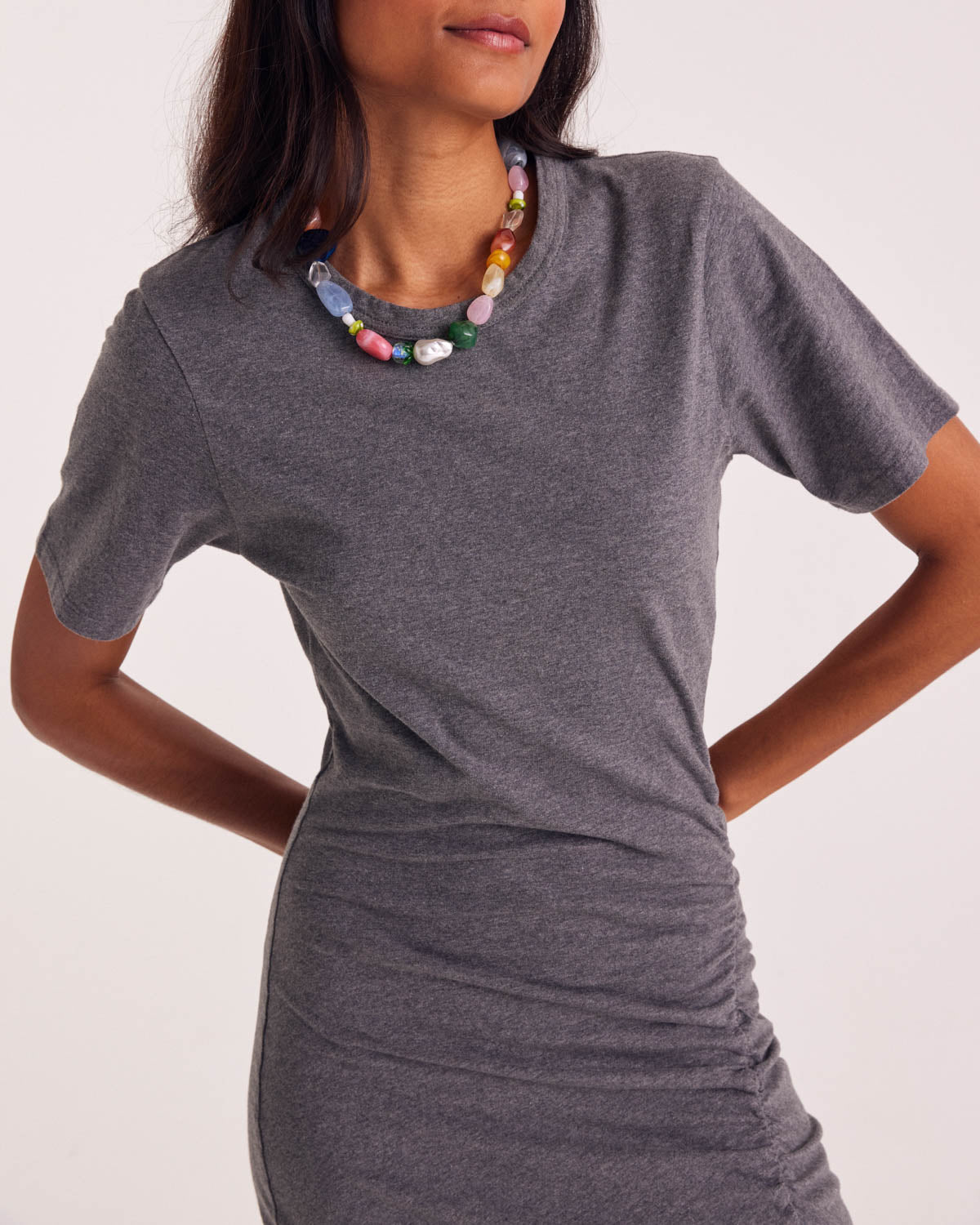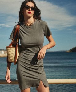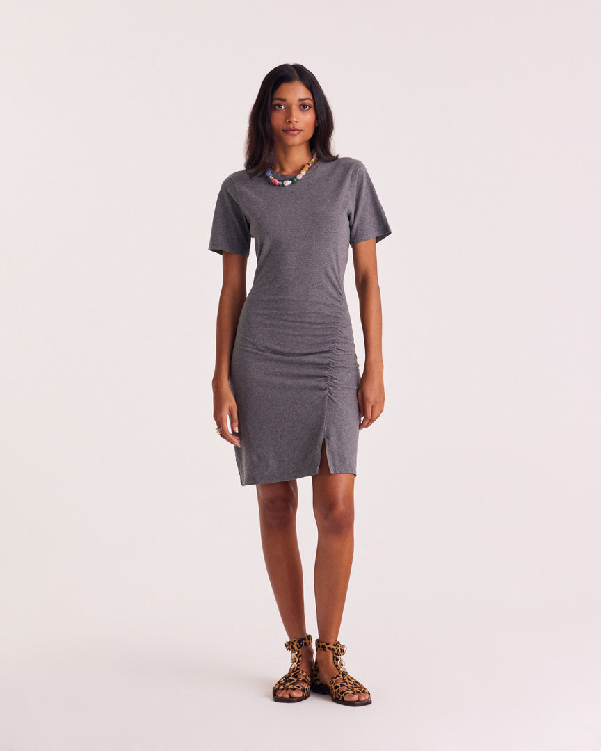 La robe Floréal gris anthracite se porte près du corps et donne une silhouette élancée avec sa fente sur le côté.