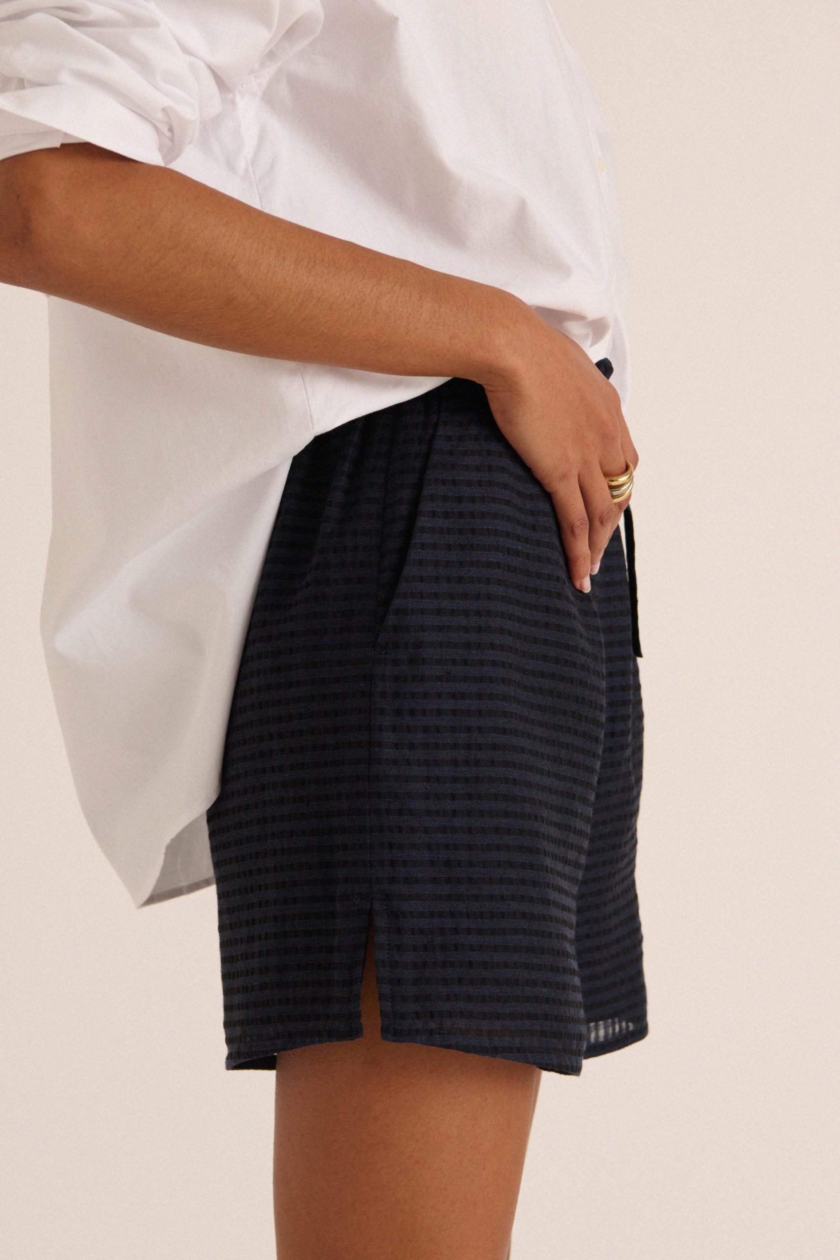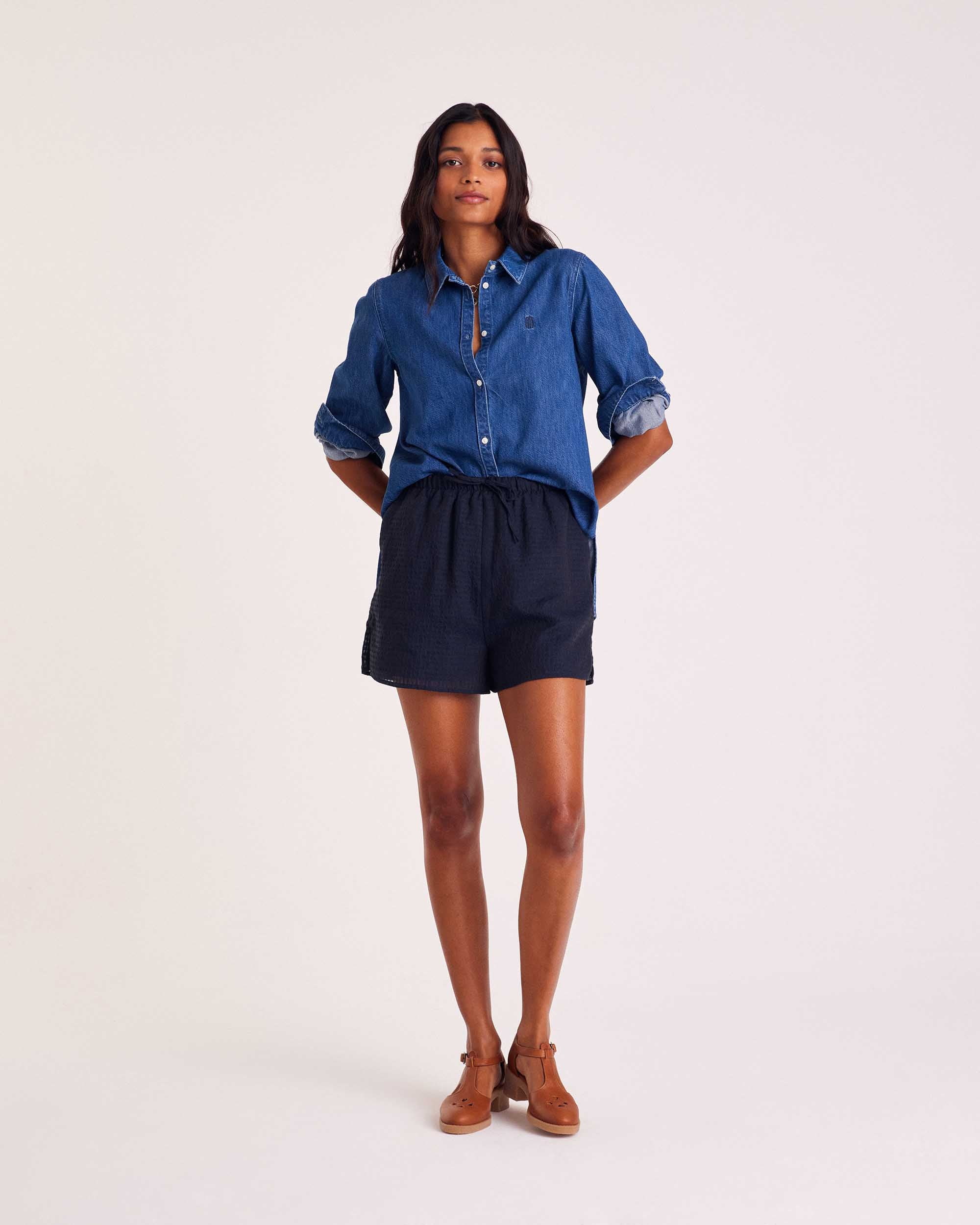 Le short Lino marine sera l’indispensable de votre été. Avec sa coupe fluide, son noeud à la taille et sa matière T.P.R (Toujours Plus Responsable), il apporte légèreté et confort à vos tenues. Il s’associe parfaitement avec le top Gersende marine.