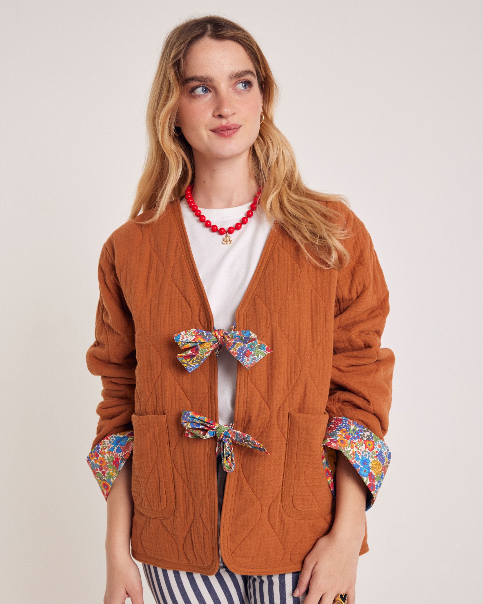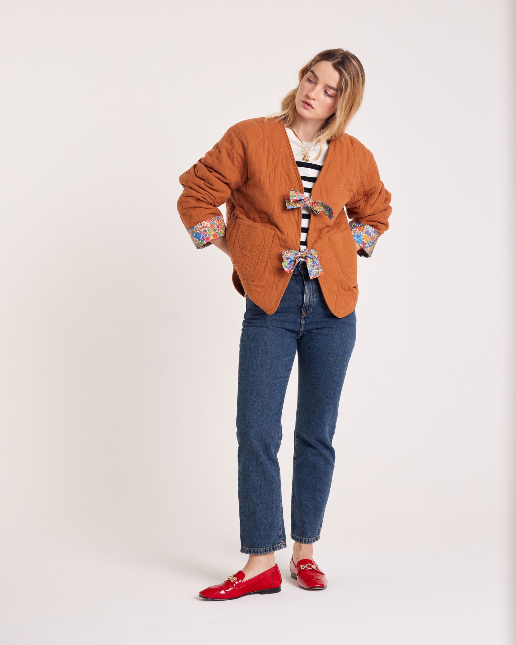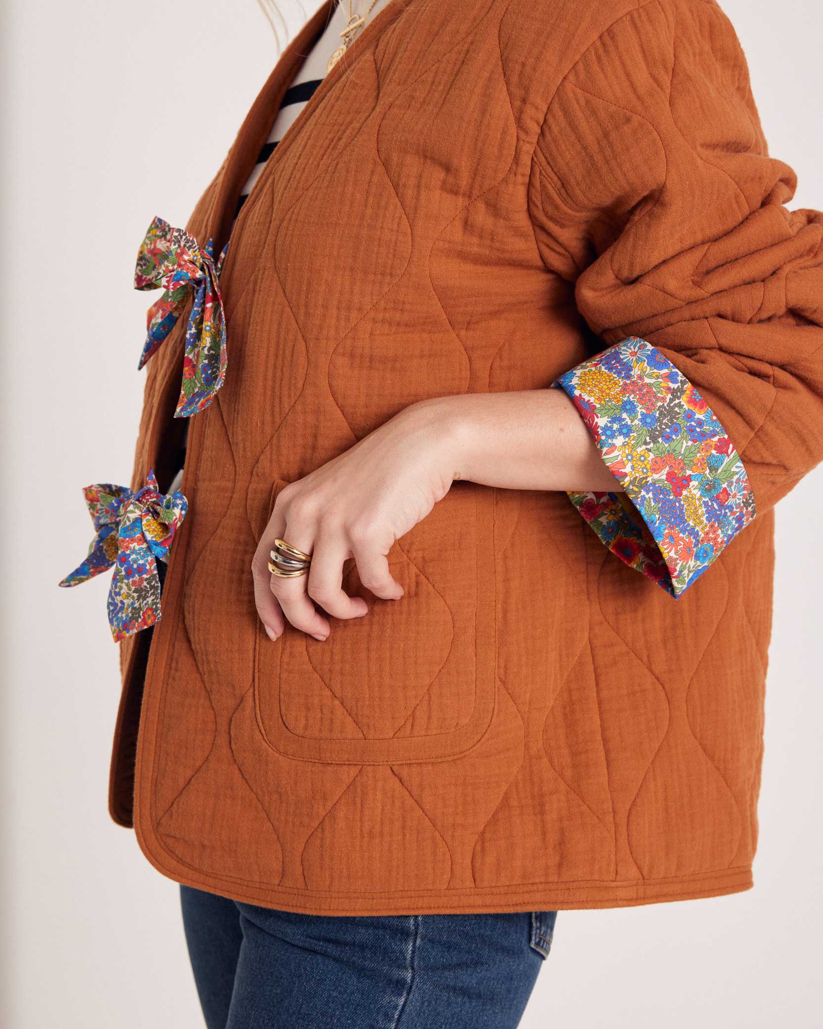 Ne cherchez plus la veste de mi-saison idéale, Poppy est celle qu’il vous faut ! En gaze de coton terracotta, elle séduit par son matelassage au motif vague et ses détails Liberty raffinés. Sa coupe effet sablier et son encolure V en font une pièce élégante et facile à porter.